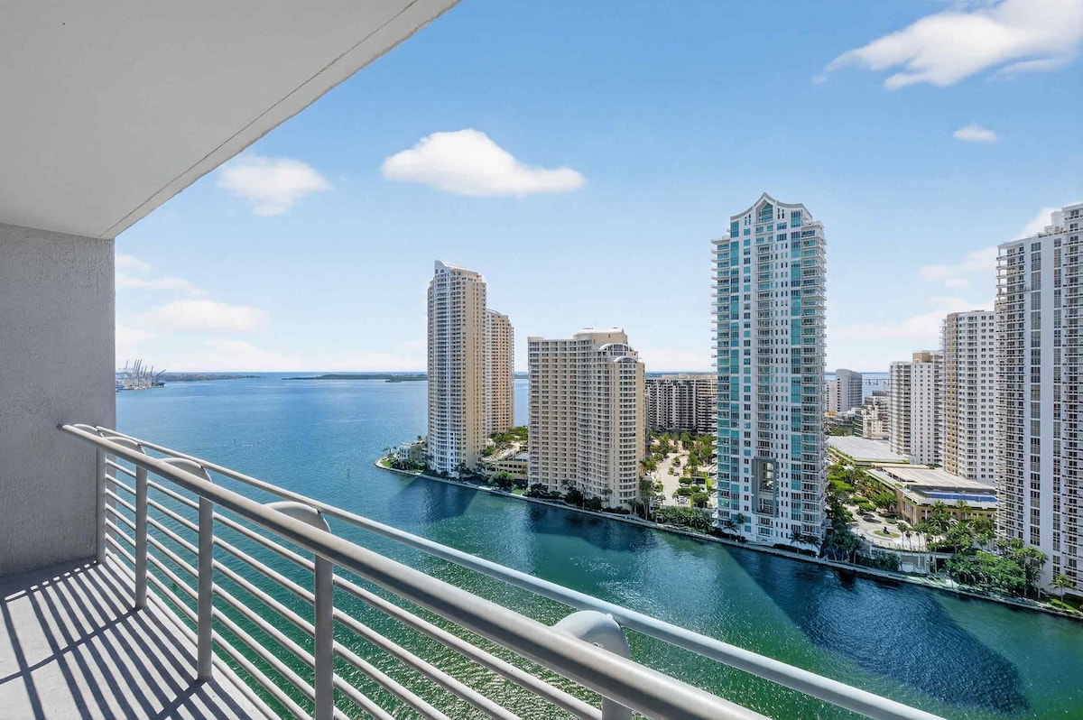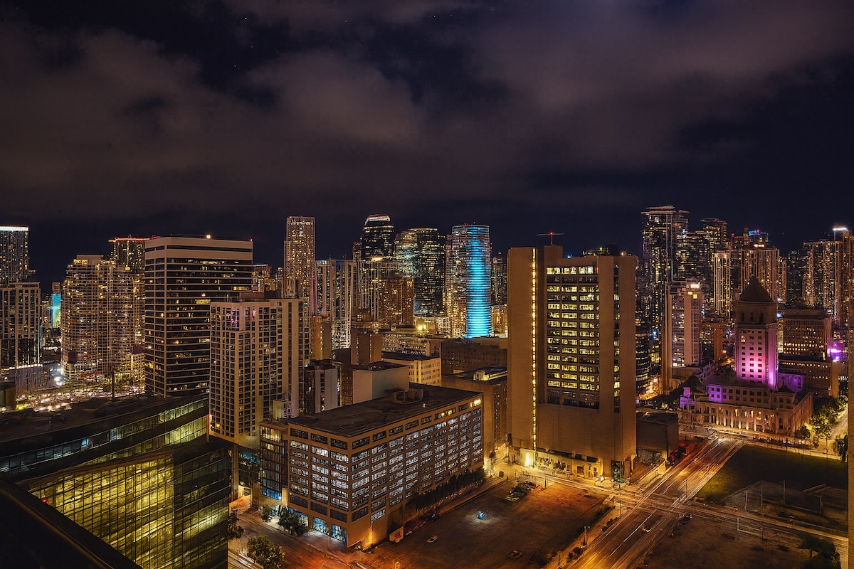 Increíble estudio de 26 pisos con vistas tanto a la ciudad como a la bahía. (a 6 millas del Kaseya Center) (a 3 millas del mercado de Bayside) Disfruta del balcón en la cómoda silla de huevo, disfruta del desayuno o la cena en la mesa exterior para dos. Mesa de comedor con capacidad para cuatro personas. ¡Hay muchos juegos y diversión! Estudio con capacidad para 7 personas con cama king, colchón de aire queen, sofá cama completo y silla que se convierte en cama individual. Todo con sábanas y almohadas designadas. Piscina en la azotea Aparcamiento 15 $/día