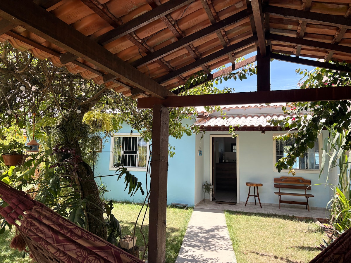 Delicioso lugar aireado con poco movimiento y que rezuma tranquilidad es lo que encontrarás en esta encantadora casa. Cuenta con un extenso césped con muchos detalles en cada rincón: pérgola, fuente, hamacas, columpio, piscina, huerta (PRIVADOS). Situado en el Condominio Orla 500, cerca de Búzios, Cabo Frio y Rio das Ostras. A 800 metros de la playa. Wi-Fi para home office, Netflix, barbacoa portátil de carbón. Nota: No permitimos que los huéspedes reciban visitas para pasar el día, etc.