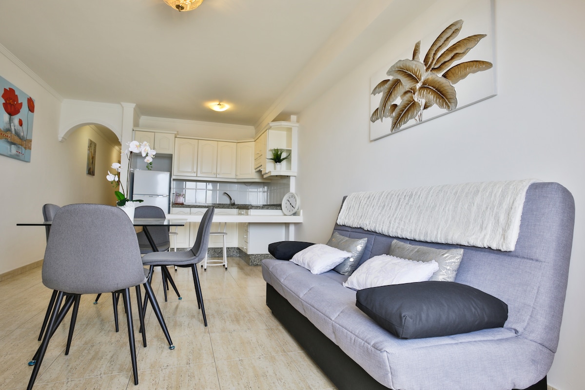 Magnífico apartamento en Playa Las Vistas, entre Los Cristianos y Las Américas, moderno, luminoso, soleado y con vistas panorámicas. Tiene 1 habitación con cama doble, 1 baño con ducha de 150x 80 cm, salón con sofá- cama, terraza de 10 m2 con una mesa para 4 personas, orientación sur, cocina bien equipada, cerca de todos los servicios. El complejo cuenta con piscina, aseos, 2 ascensores, jardines bien cuidados, acceso para personas con discapacidad, a muy pocos minutos de todos los servicios.