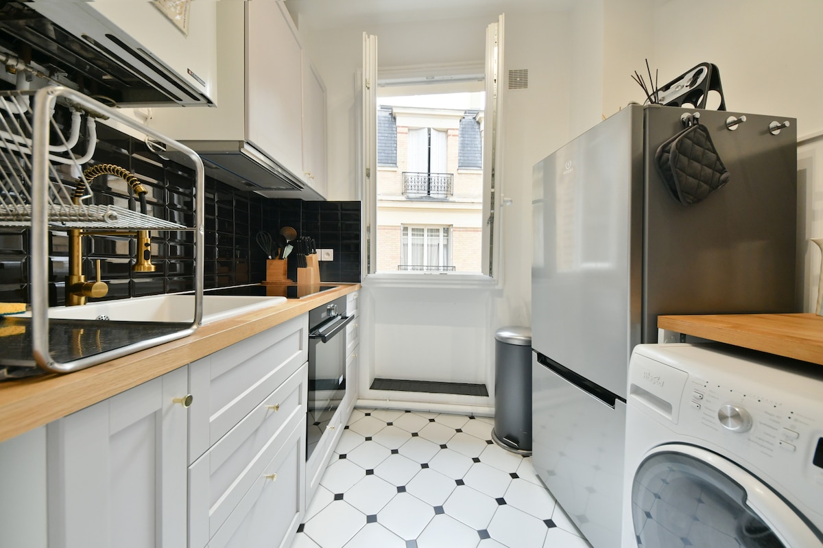 Apartamento con encanto, lujoso, acogedor y luminoso de 31 m2 (1 dormitorio - 4 personas) idealmente situado en París 16 en una zona céntrica, cerca del Trocadero, y tranquilo (a 5 minutos del metro Jasmin) con todos los comercios de proximidad. El alojamiento ofrece acabados modernos y cálidos y un espacio optimizado: dormitorio y sala de estar (sofá cama) separados por una elegante partición con un televisor integrado extraíble. Está totalmente equipado (electrodomésticos, ropa de cama, etc.) para que disfrute serenamente de su estancia.