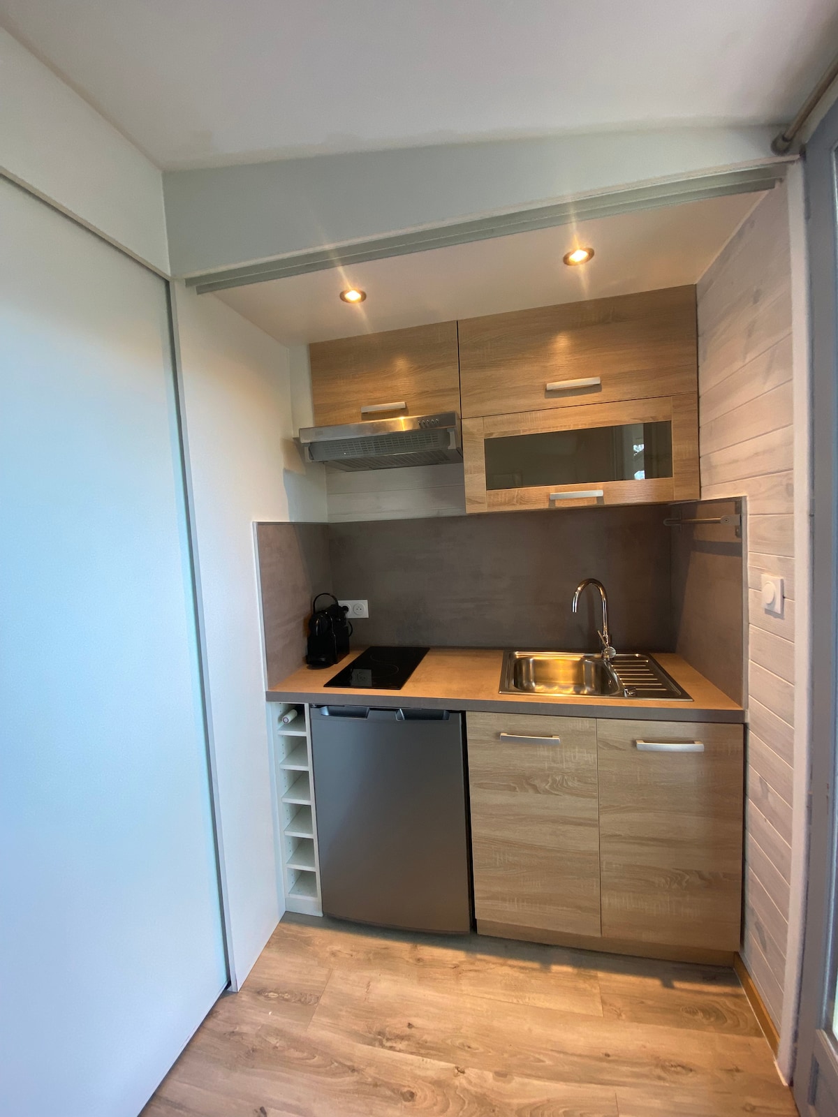 un encantador chalet de dos habitaciones con aire acondicionado y con todas las comodidades modernas: un dormitorio independiente con una cama grande de 160 x 200 cm (colchón y somier nuevos), un baño moderno (cabina de ducha, toallero eléctrico…) y una amplia sala de estar con cocina equipada bañada por la luz y equipada con un cómodo sofá, una mesa con taburetes y un televisor de 140 cm. En el exterior, tendrá una zona de relajación bajo un magnífico olivo.