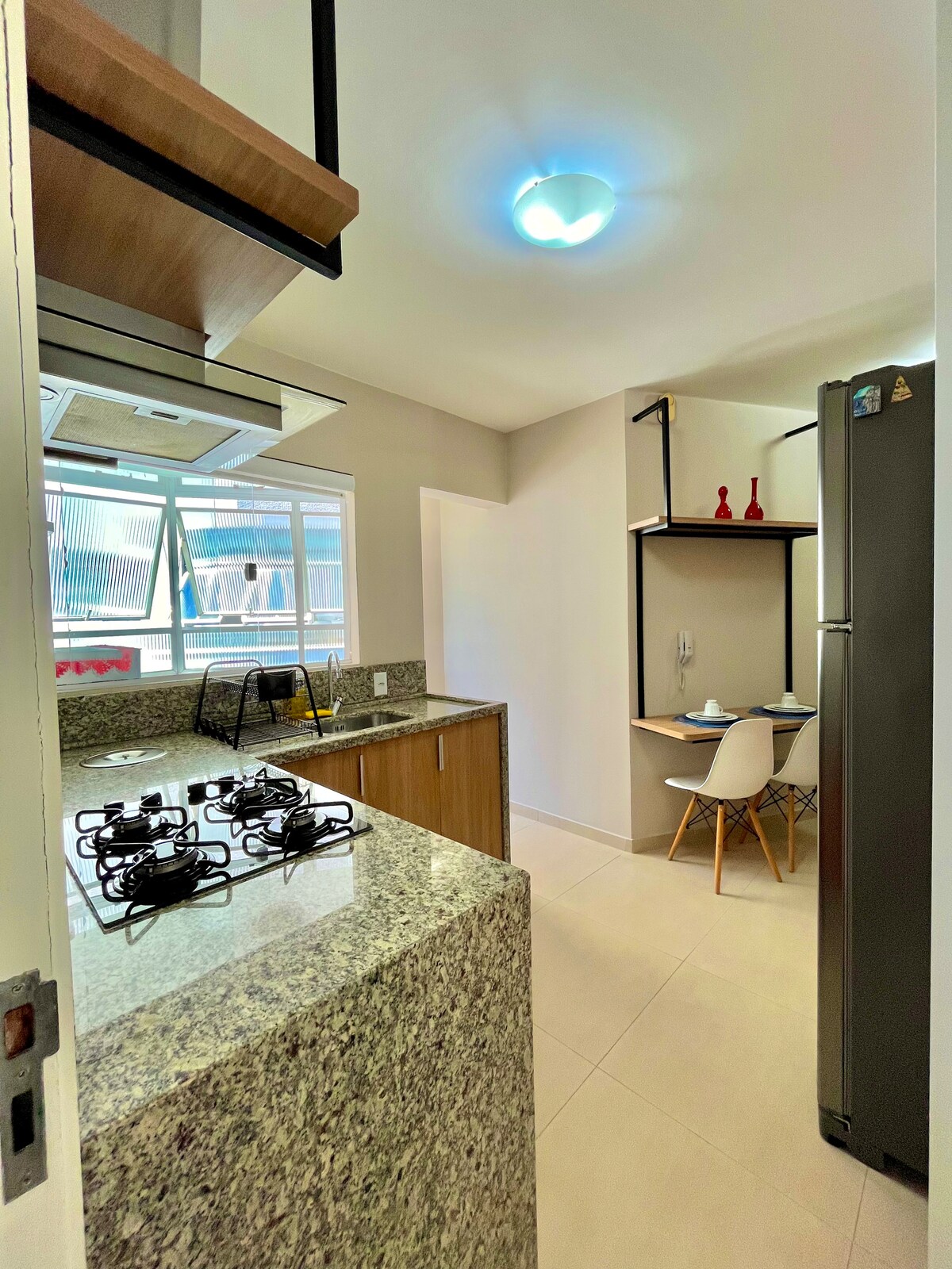 Sofisticado apartamento tipo estudio ubicado a 800 metros del parque Vila Germânica, lugar de eventos como el Oktoberfest. Rodeado de restaurantes, bares y supermercados. Todo para su comodidad: Smart TV 50" Samsung, aire acondicionado split, ducha de gas, wifi fibra 240mb, cocina completa con heladera Brastemp, microondas, horno, estufa, campana extractora, cafetera, purificador de agua, lava y seca, armarios, y por supuesto ¡una cama queen con el mejor colchón!