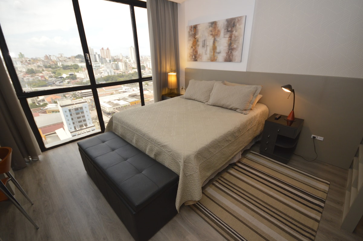 Loft decorado, bien iluminado y aireado, frente a la plaza de la estación de autobuses de BH, cerca de tiendas, restaurantes y atracciones turísticas. Policía militar al frente. Tiene aire acondicionado y ventiladores de techo, una cama tamaño queen y un cómodo sofá cama. Tiene dos televisores inteligentes, un horno eléctrico, microondas, estufa eléctrica de un solo fuego, cafetera, sartén eléctrica y hervidor de agua, sandwichera, plancha y secador de pelo. Minimercado y gimnasio en el entrepiso. No tiene su propio espacio de estacionamiento.