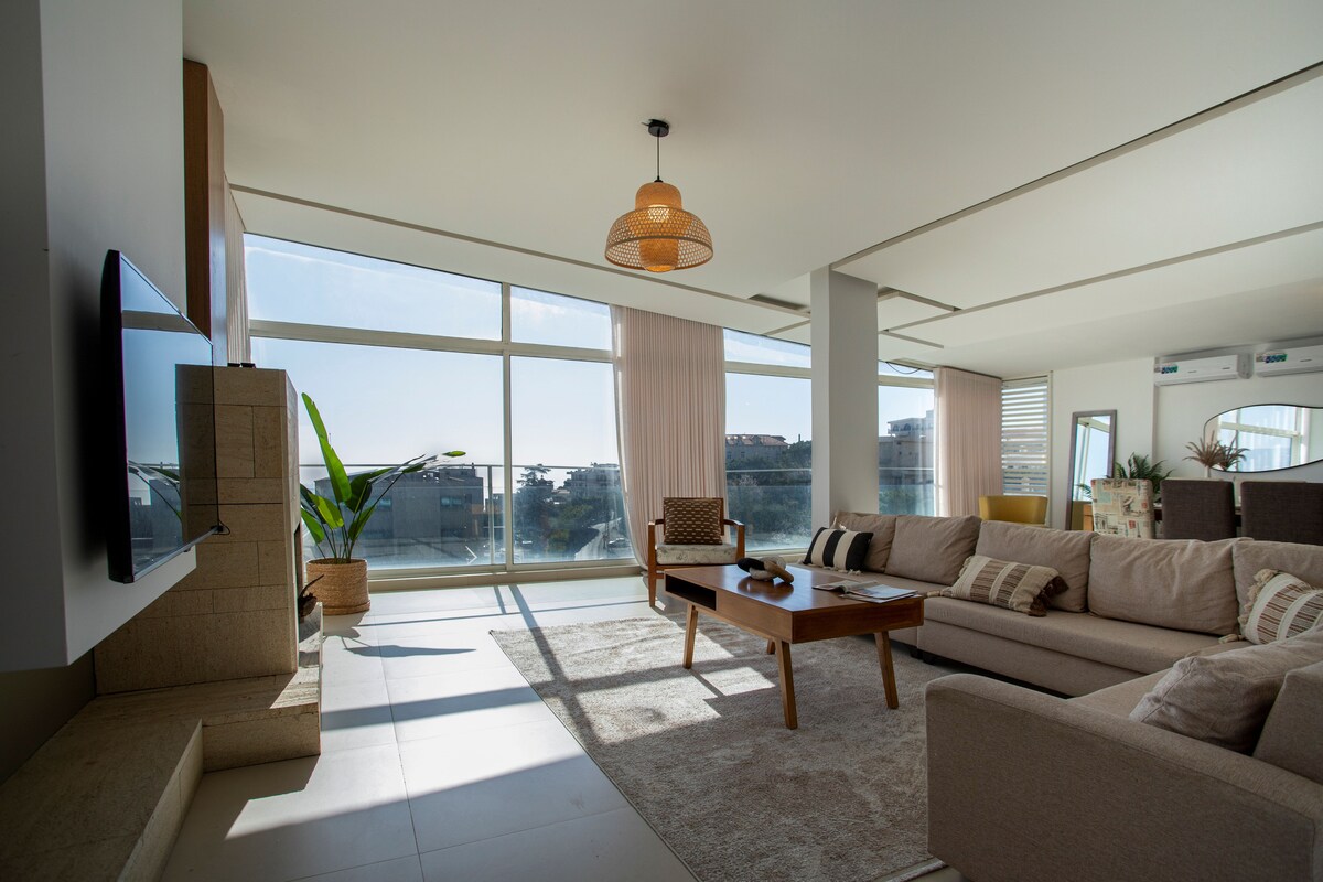 Un ático único en Adma con un diseño moderno y minimalista, rodeado de bosque y con impresionantes vistas al mar en completo silencio. El espacio es excepcionalmente grande y abierto, lo que lo hace perfecto para familias y grupos de amigos. Cuenta con comodidades de primera calidad que incluyen un jacuzzi interior, una chimenea interior y una zona de parrilla, creando un refugio privado y tranquilo donde el lujo se encuentra con la naturaleza. Unidad de TV de 96 pulgadas para películas 🍿 3 estacionamientos subterráneos gratuitos Ascensor las 24 horas, 7 días a la