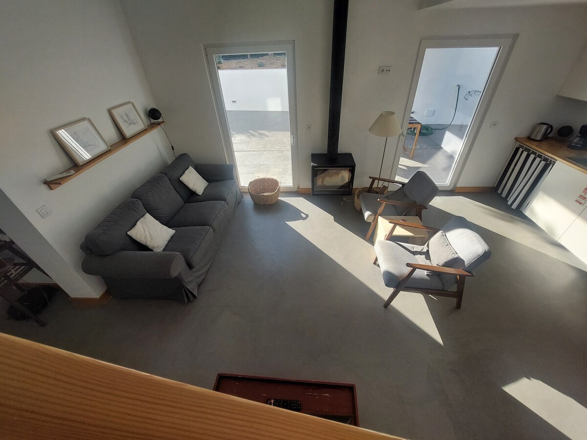 Esta increíble casa casera está recién renovada y ubicada en nuestra pequeña granja donde cultivamos verduras y árboles frutales. La casa está hecha de tierra apisonada y piedras, situada a pocos metros del hermoso río de Seixe, rodeada de verdes colinas y campos. El valle es muy tranquilo y lleno de animales como vacas, caballos, cabras, burros, cerdos y ovejas. ¡En los días calurosos puedes darte un chapuzón refrescante en el río o visitar la increíble playa a solo 6 km de distancia!