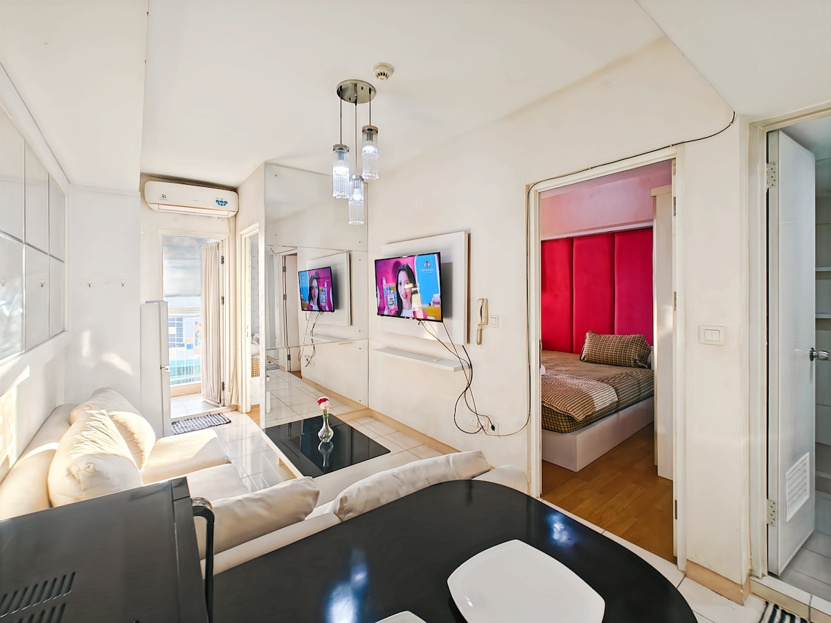 Wifi de alta velocidad. Netflix. ¡Descuento por estancias largas! 🚭 La única suite única en esquina de 2 BR con diseño industrial chic. Ya sea que te quedes por negocios o por fin de semana, garantizaremos tu estancia cómoda. Esta unidad de autoservicio PARA NO FUMADORES ubicada en 32nd fl, con increíble vista al paisaje de Bekasi, carretera elevada MBZ y tren de alta velocidad LRT +. Cuenta con electricidad de 2200 vatios, aire acondicionado, nevera y utensilios de cocina completos para 4 personas. Lagoon Mall se encuentra justo debajo del apartamento. El estacionamiento NO es gratuito.