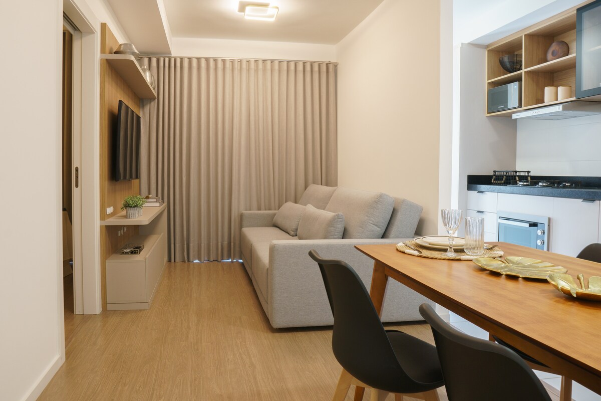 ¡Apartamento completo y acogedor en Gleba Palhano! A 300 metros de la avenida principal de la Av. Ayrton Senna y el centro comercial Aurora Mall, donde se encuentran el mercado, restaurantes y cines. A 500 metros de la postal de la ciudad de Londrina, el lago Igapó, puedes ir allí a dar un paseo o simplemente disfrutar de la hermosa puesta de sol. Apartamento con piscina, gimnasio, garaje privado, coworking, sala de juegos y lavandería (tarifas). ¡Conserje las 24 horas!