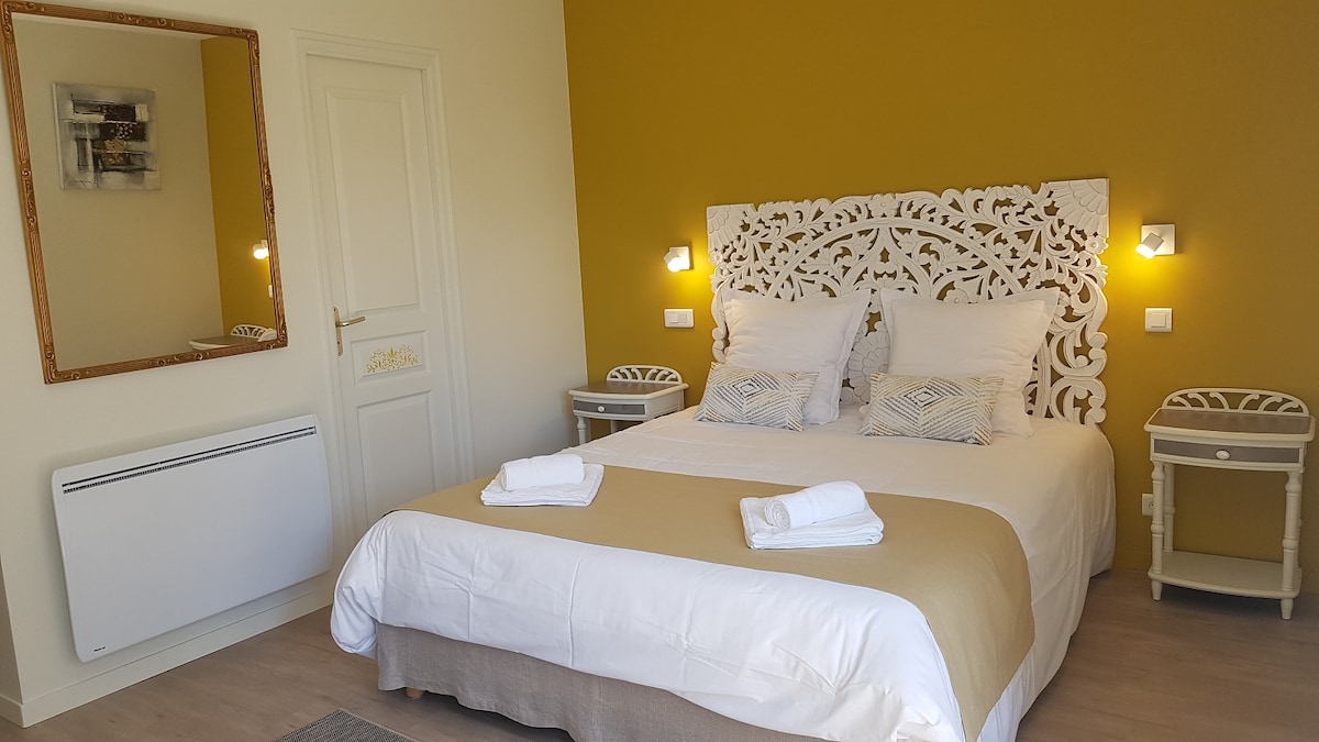 Ofrezco una habitación espaciosa de 14 m² (con una cama de 160*200, televisión y wifi gratuito) en el primer piso de mi casa. Este nivel estará reservado para usted. Tendrá su baño privado con lavabo doble e inodoro. Si lo desea, también puede beneficiarse del aparcamiento cerrado. Los desayunos se sirven en la sala de estar o en la terraza cuando el tiempo lo permite. El precio incluye el impuesto turístico y el desayuno para 2 personas .