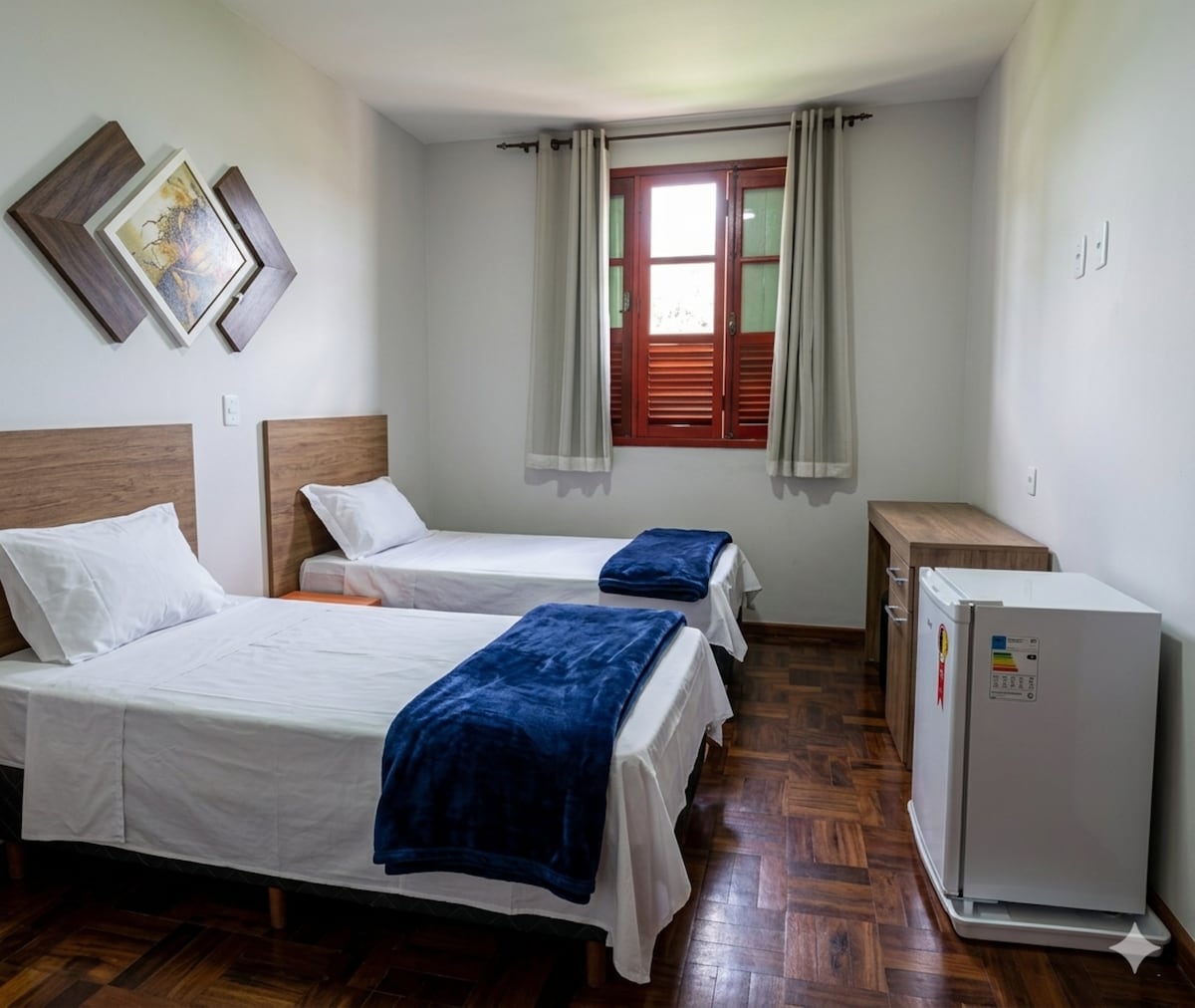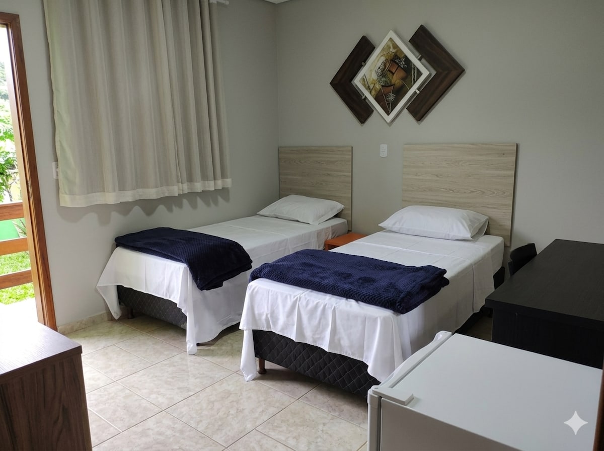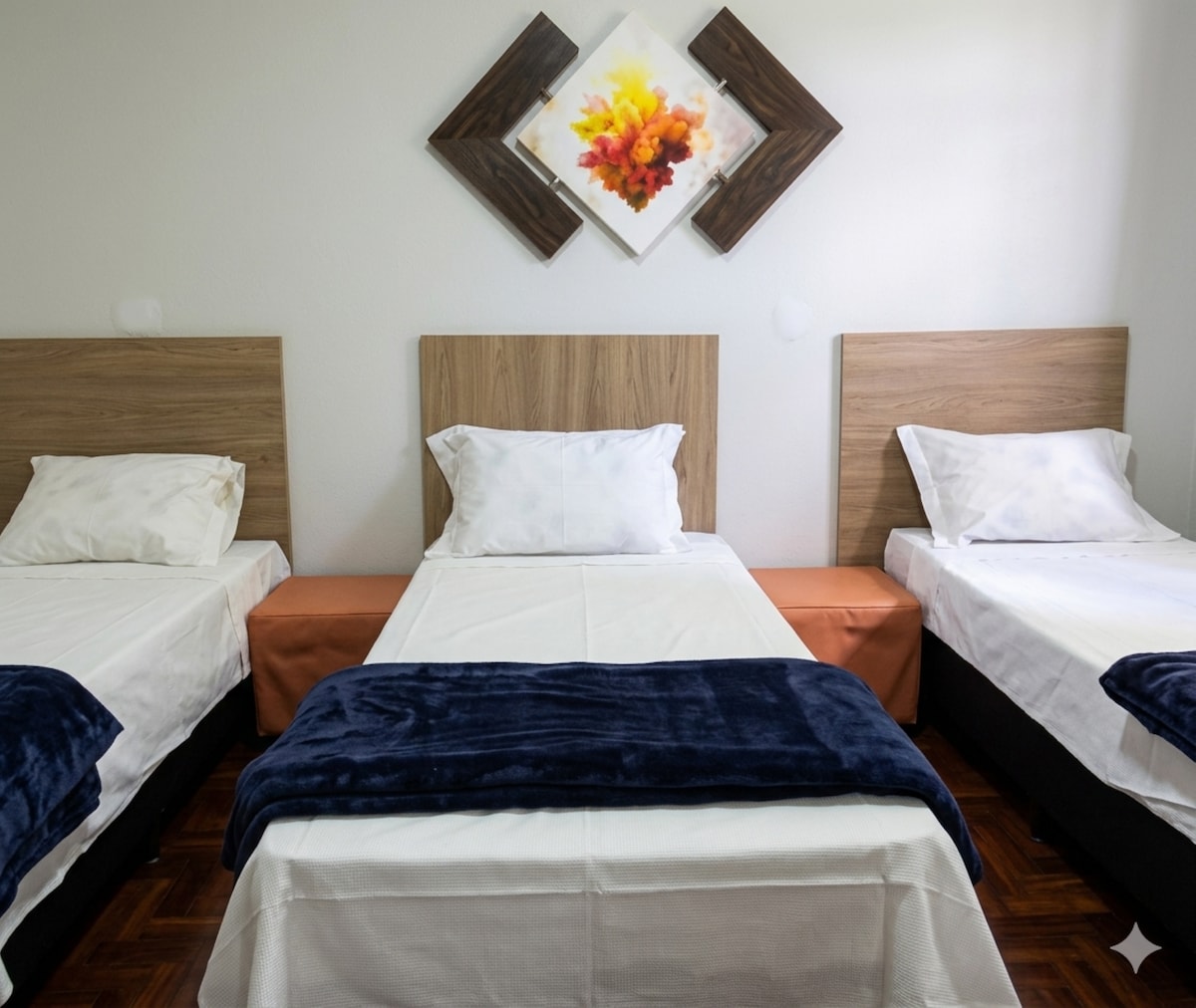 Quarto espaçoso para até 5 pessoas, com 1 cama de casal e 3 de solteiro, ideal para famílias ou grupos. Equipado com SMART TV, Wi-Fi, banheiro privativo e AR CONDICIONADO. O Hotel Move BH está no coração de Belo Horizonte, próximo a pontos turísticos, rodoviária, praça da estação e áreas comerciais. Conforto, praticidade e excelente custo-benefício em uma localização central. Café da Manhã cortesia!