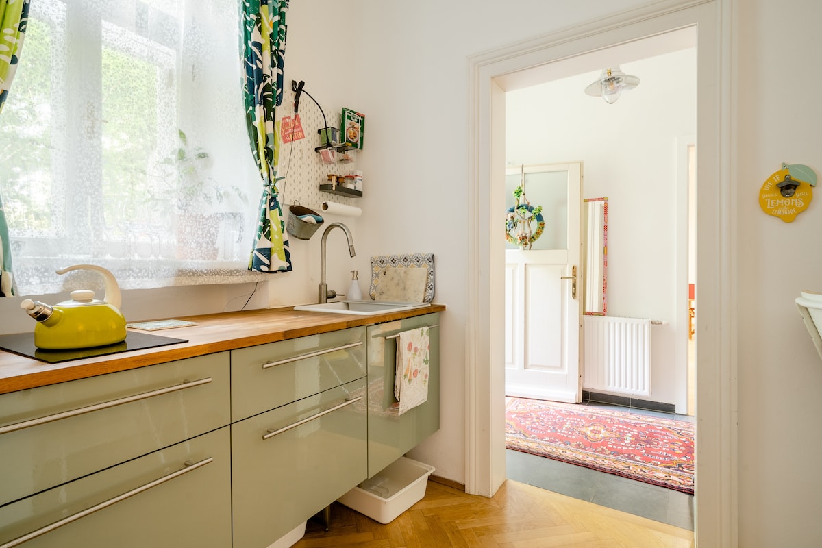 Nuestro apartamento de unos 44 m² con balcón y de color amarillo mostaza es perfecto para viajeros de negocios o descubridores de Viena. A pesar de su céntrica ubicación, se encuentra en un entorno verde y tranquilo, por lo que es ideal tanto para relajarse como para estar en el centro de la acción. Gracias a su equipamiento completo, todos nuestros huéspedes encontrarán todo lo necesario para sentirse como en casa.