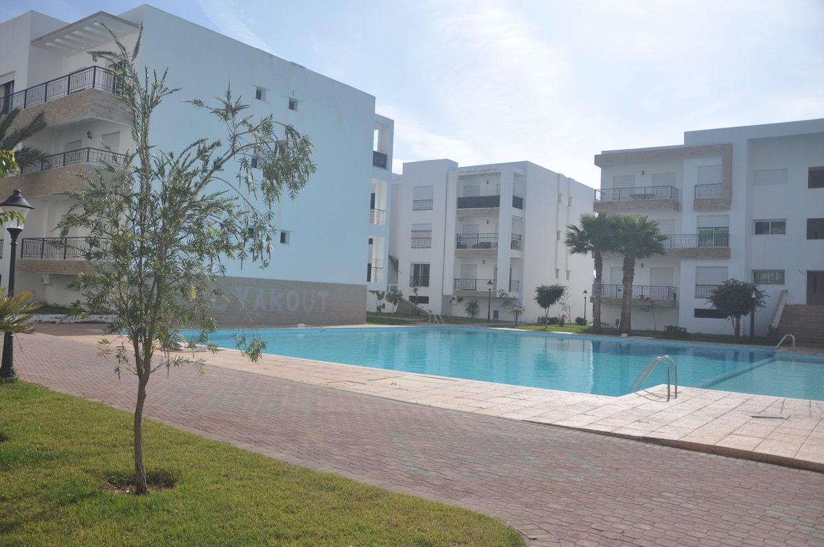 Muy bonito apartamento situado entre Mohammedia y mansouria en una residencia privada, que consta de 2 dormitorios con vistas a la piscina, un gran salón luminoso con vistas a la piscina, un baño, una cocina americana bien equipada . Este apartamento se encuentra a 5 minutos de Marjane, a 3 minutos de Zimmer Beach, a 5 minutos de la playa de Sablettes y a 25 minutos de la playa de Bouznika. Muy bien equipado y soleado este apartamento es un remanso de paz que le ofrecerá todas las comodidades que busca .