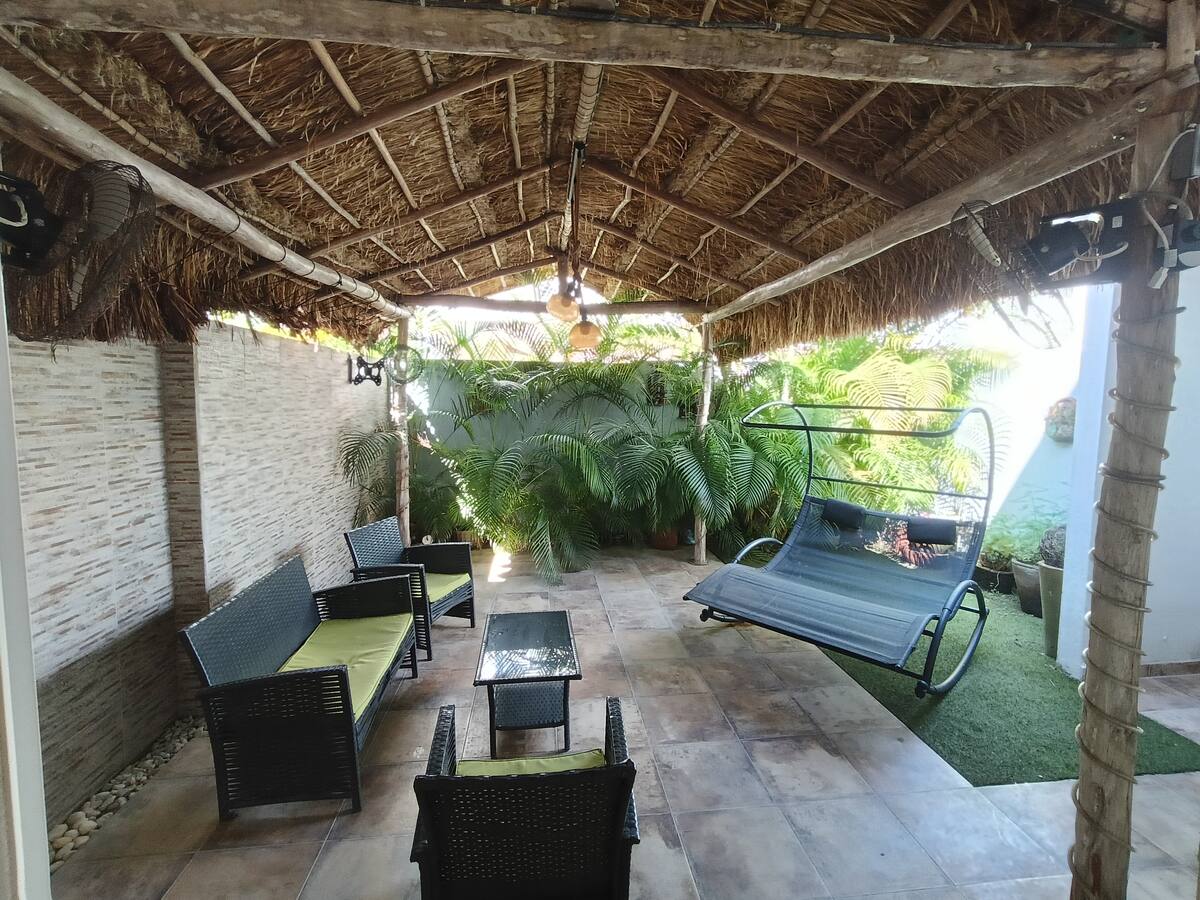 Hermosa casa bien decorada en un barrio tranquilo. A 5 minutos del mercado, a 10 minutos del centro de la ciudad y a 15 minutos del aeropuerto y de la playa en la Zona Hotelera. Cuenta con piscina y un bungaló para comer fuera. También puedes disfrutar cuando estás en temporada (mayo-julio) de árboles de mango, coco y plátano.