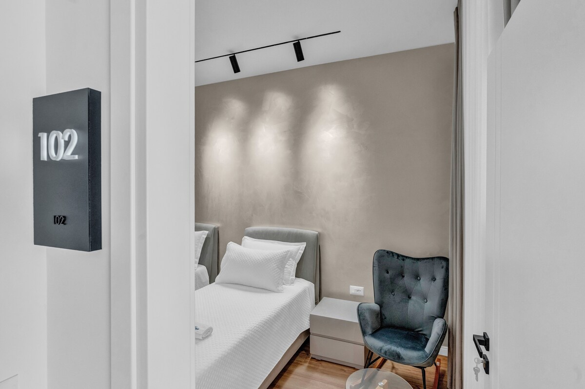 Kaja Studio Berat 102 offers a cozy and stylish environment perfect for unwinding. The studio includes a comfortable double bed and a single bed, a well-appointed bathroom, and a fully functional kitchen. Guests can relax on the shared patio and enjoy the convenience of safe parking. Ideally situated near city bus routes and within walking distance to Berat town's main attractions, this studio combines comfort with accessibility.