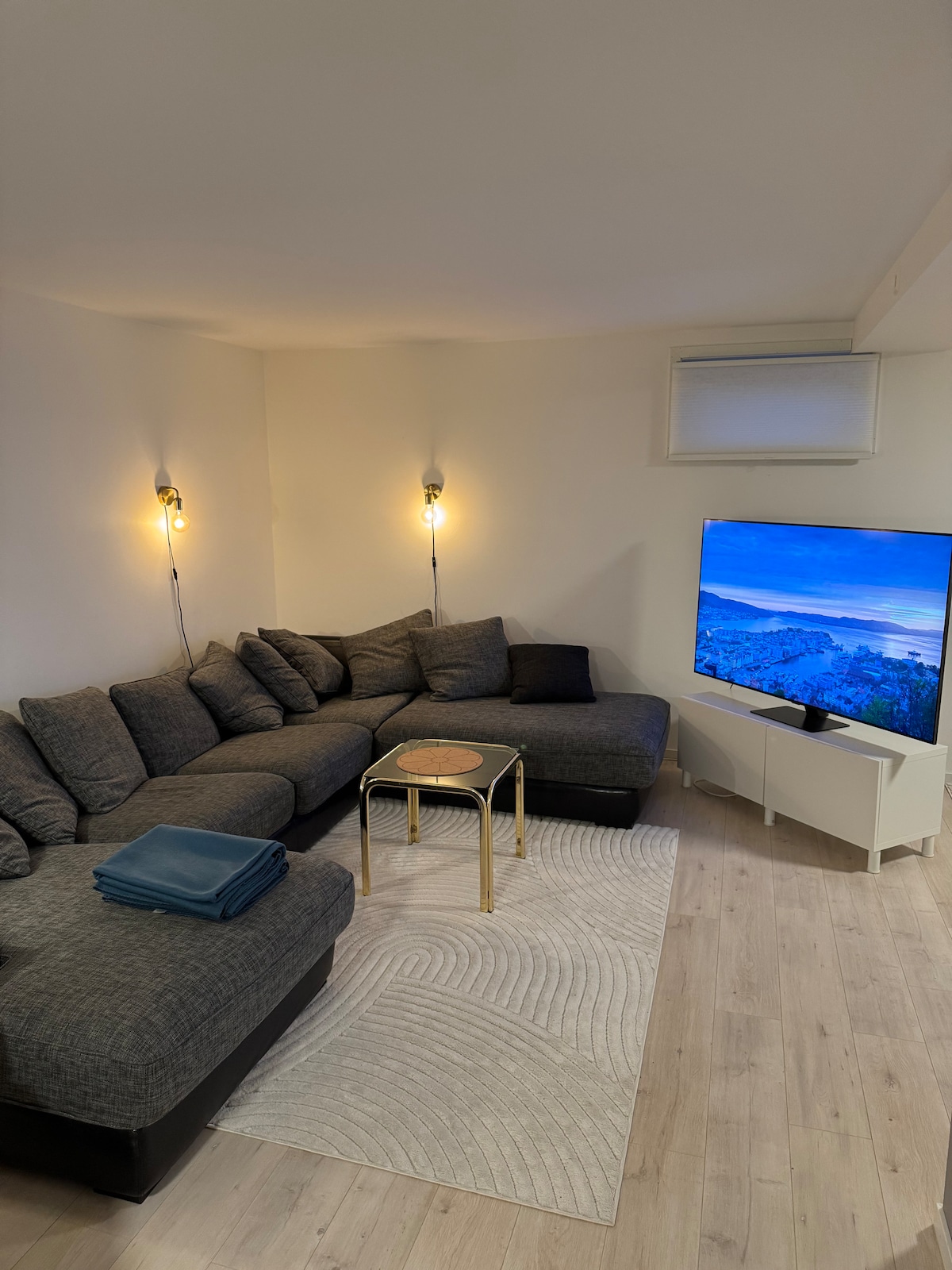 Apartamento recién renovado en un entorno tranquilo con patio soleado y plaza de aparcamiento privado gratuito. A poca distancia del aeropuerto (7 min) y del centro de la ciudad de Bergen (15 min) en auto. Buena oferta colectiva a ambos lugares a 5 minutos a pie. El apartamento tiene unos 35 m2 y tiene un alto nivel. Calefacción por suelo radiante, cocina moderna, un dormitorio acogedor y baño nuevo con lavadora y secadora. También hay acceso gratuito a wifi y TV con Apple TV disponible en el departamento. Distancia a pie a tienda/restaurante (7 min).