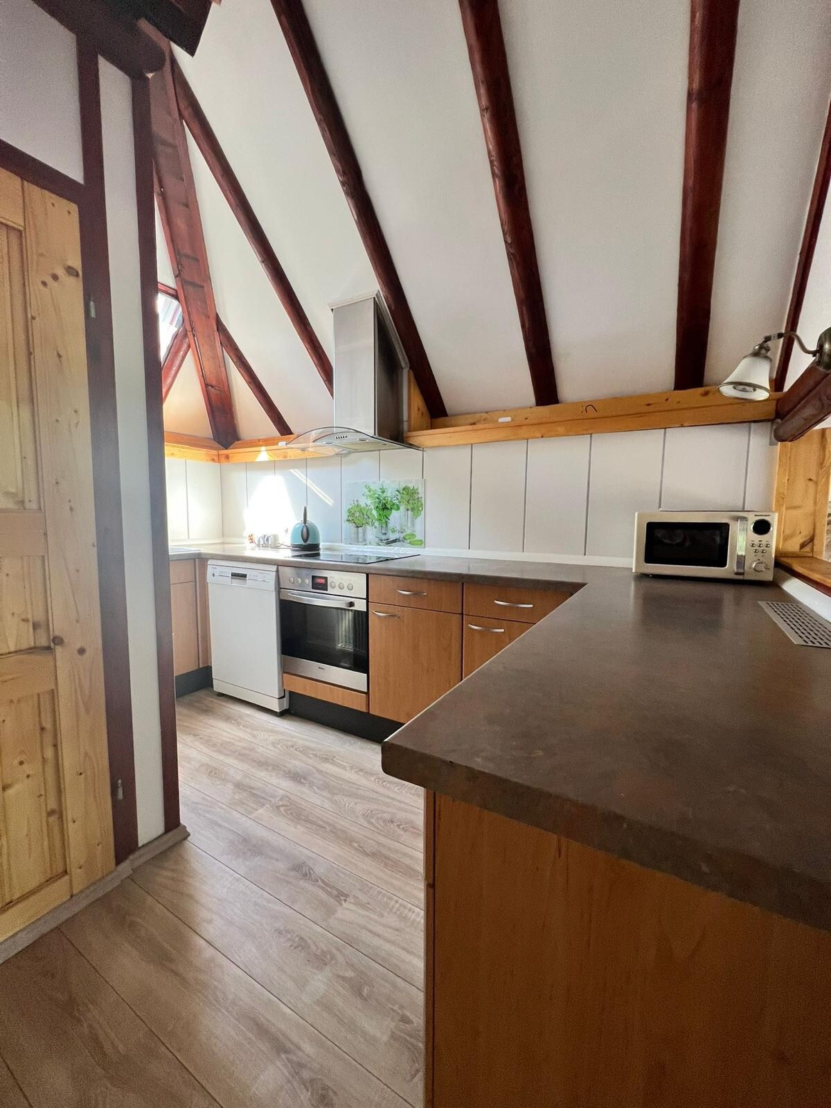 En el borde del bosque del Palatinado, integrado en un parque de una villa industrial de la época de los fundadores. El apartamento se encuentra por encima del garaje de carruajes y el establo de caballos, ambos con unos 300 años de antigüedad. El antiguo apartamento del cochero fue reformado con cariño hace dos años y ha conservado su encanto con muchos elementos antiguos. Ducha nueva, cocina muy espaciosa. Adecuado para un máximo de 4 personas. Idealmente, una pareja con dos hijos, ya que el dormitorio pequeño (140x200) es una habitación de paso.