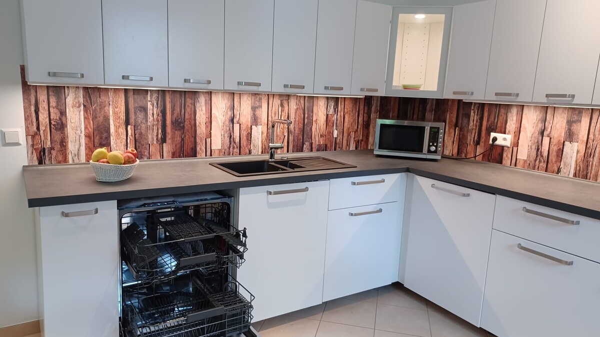 Autorización: 03/Z/AZ/003649-18; los bebés/niños pequeños pagan el precio completo. Apartamento independiente de 80 m²: 1 dormitorio/sala de estar, 2 dormitorios adicionales, 1 cocina, 1 baño, 1 pasillo, 1 sala de trabajo, luminoso, amueblado, TV digital, HiFi, Internet rápido, WLAN de malla, sofá, mesa familiar, cocina funcional, lavavajillas, casa de jardín con salón de ratán. En el ático 1 oficina más. Entrada/pasillo independiente, aparcamiento justo enfrente, WALL-Box para E-KfZ (con cargo). Supermercado, médicos, restaurante cerca