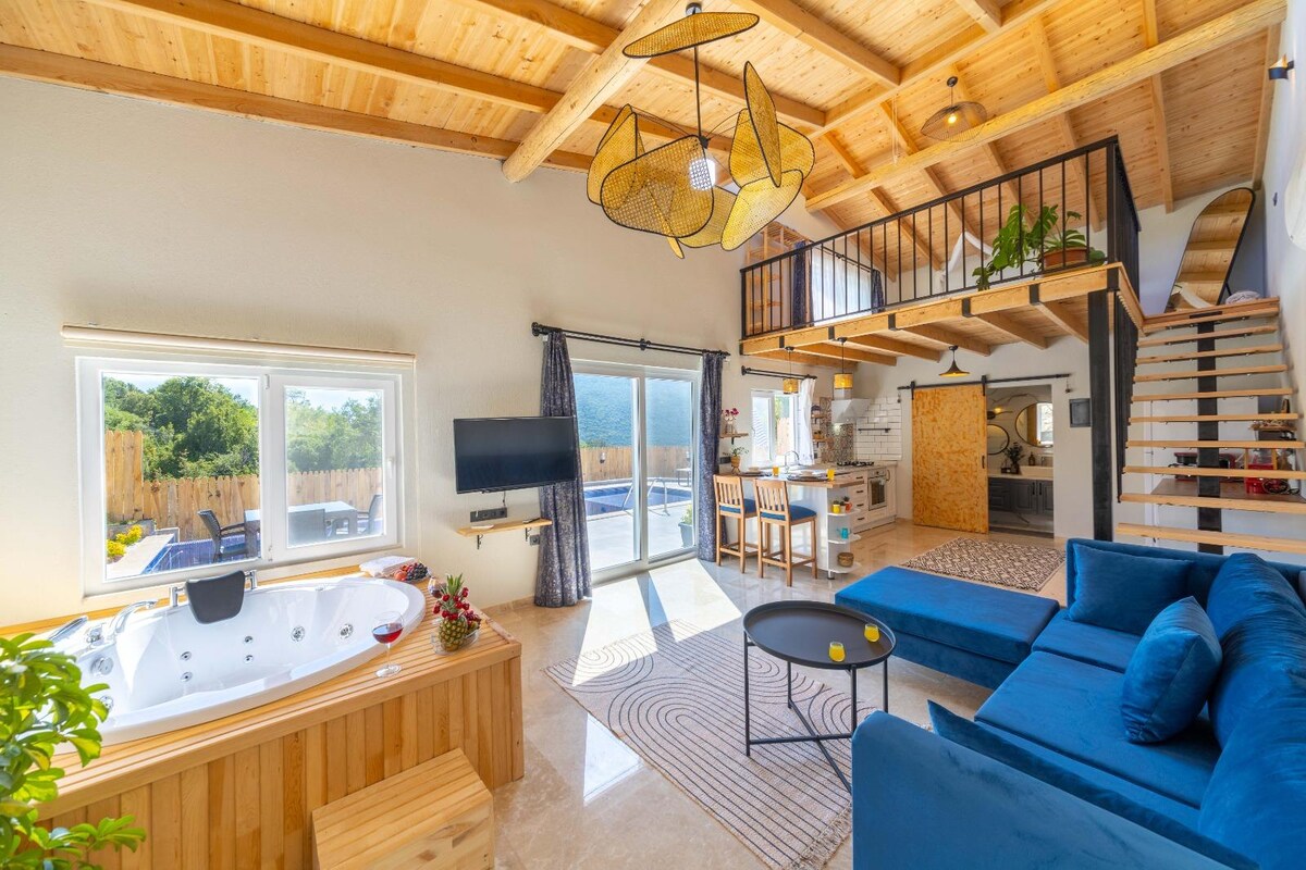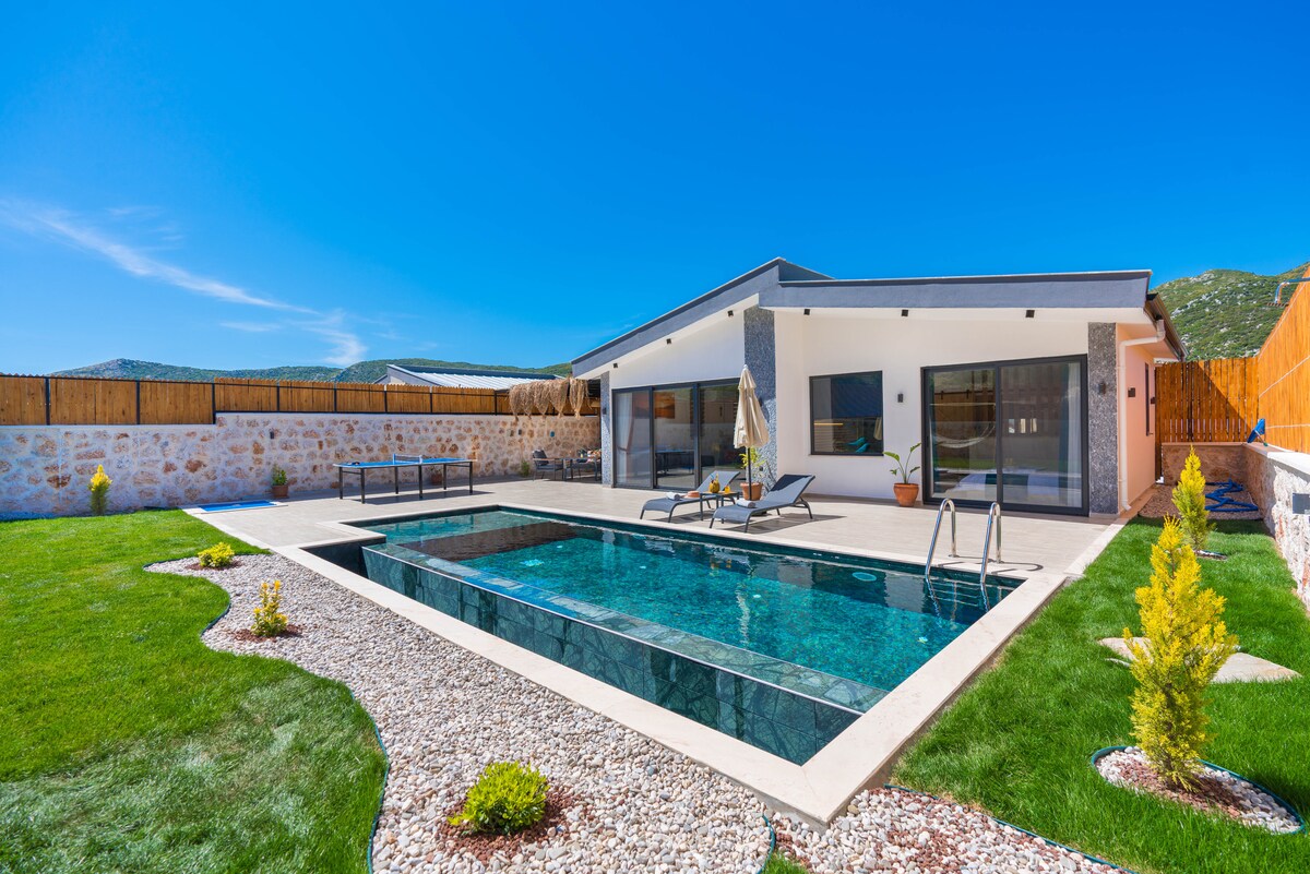 Kalkan merkeze yaklaşık 3 km olan villamızın yatak odasında jakuzi ve ebeveyn banyosu bulunmaktadır. Oturma odası ile birleşik açık plan mutfak mevcuttur. Geniş havuz terasında yemek masası, 2 şezlong, şömine ve 2 kişilik salıncak; villamız içinde ihtiyaç duyabileceğiniz mobilya mutfak araç gereçler vardır. Villamızın havuzu yerden yüksek olmakla birlikte, havuz terası ahşap çitlerle çevrilmiş ve korunaklı hale getirilmiştir. Arkadaki villlalardan görünmez. Muhafazakar aileler için uygundur.