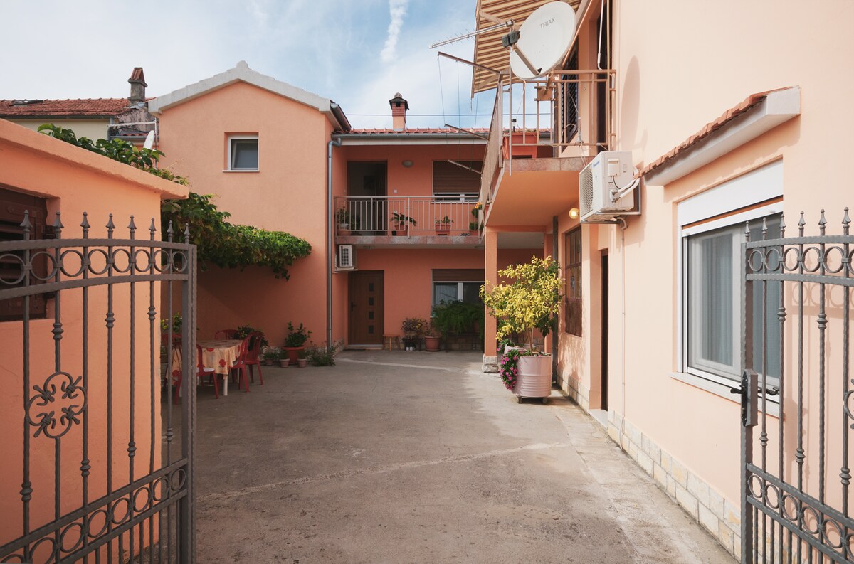 Opustite se u dvosobnom apartmanu sa 2 bračna kreveta plus pomoćni ležaj,kao i mogućnost korištenja putnog kreveta za bebu. Apartman se nalazi u mirnoj ulici bez puno prometa,okružen maslinama i borovom šumom. Nalazi se u obiteljskoj kući,ima svoj besplatan parking,tv,perilicu,klimu,wifi, veliko dvorište na kojem se ujedno nalazi i prostor za sjedenje,druženje kao i razne igre za djecu,također ima i mogućnost korištenja roštilja. Do plaže ima 5 min hoda,kao i do centra i restorana. Dobrodošli