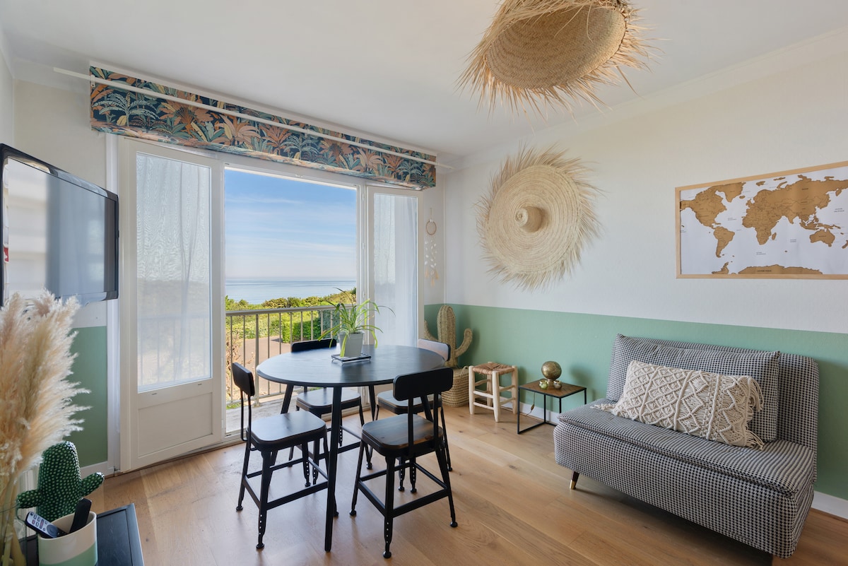 Charming 1 bedroom apartment with a stunning view facing the ocean and the Basque coastline from the living room and the bedroom with a balcony giving a privilege viewpoint. View on the Pyrenees and the Basque countryside from the kitchen. Very well located 1' walk from the beach, 3' from the center, 2 steps from the Sentier du Littoral. A parking slot is available. A surfboard is available. Located 2km from Biarritz, 25km from San Sebastian. Quiet residence