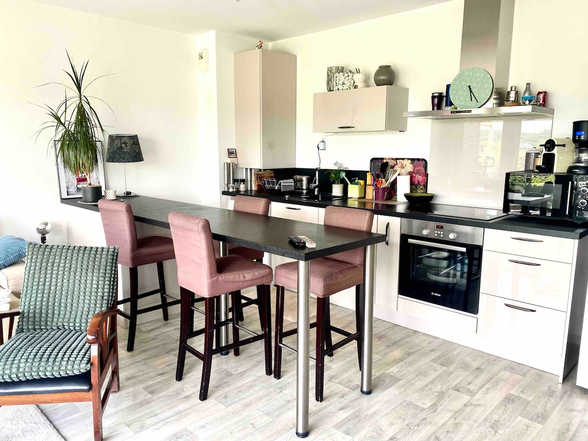 Apartamento con vistas al océano y al canal. Magnífico alojamiento renovado. Disfrutará de su luminoso espacio de vida con cocina moderna, equipada y abierta al salón. La habitación independiente dispone de acceso a un balcón con vistas al mar. Baño y aseo independientes. Ropa de cama y toallas a su llegada. Este alojamiento familiar cuenta con un estacionamiento privado y seguro.