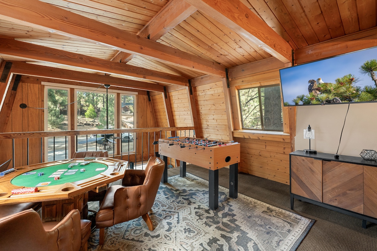 The Bear Mountain Hangout: Cabaña de estilo✔ Gambrel ✔ 3 dormitorios y 2 baños. ✔ Chimenea ✔ Bañera. Lugar para hacer fogata de ✔ propano ✔ Mesa de futbolín ✔ Mesa de póquer ✔ Capacidad para 8 personas. ✔ Se admiten mascotas ✔ Calefacción centralizada Wifi ✔ de alta velocidad. ✔ 2 plazas de estacionamiento ✔ Televisores inteligentes Atracciones cercanas: ✔ Snow Play (tubos de nieve y actividades invernales) ✔ Centro de convenciones (eventos y espectáculos) ✔ Big Bear Lake (deportes acuáticos, pesca y senderismo) ✔ The Village (compras y restaurantes) ✔ Pistas de esquí: montaña, cumbre de nieve, valle de nieve (esquí y otros deportes de invierno)