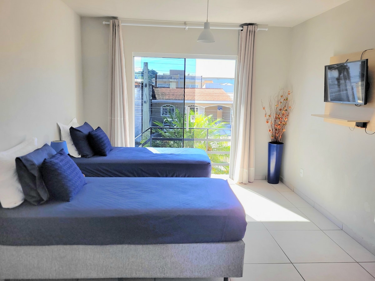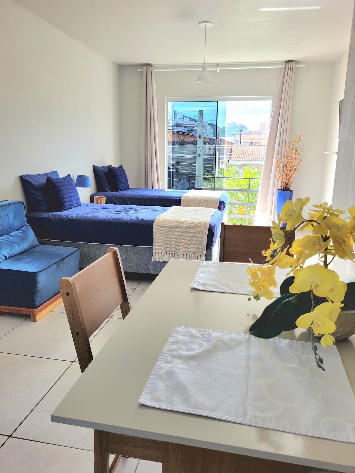 Despiértate con una vista panorámica y termina el día con la puesta de sol más hermosa de Governador Celso Ramos. La decoración es ligera y acogedora, inspirada en tonos neutros y azules, refiriéndose al océano. Nuestro espacio fue diseñado para brindar momentos de comodidad, en un ambiente acogedor, para que se sienta como en casa Nuestro departamento está bien ubicado con acceso a transporte público gratuito, donde se puede acceder fácilmente a cualquier playa, también está ubicado cerca del mercado más asequible de la ciudad.