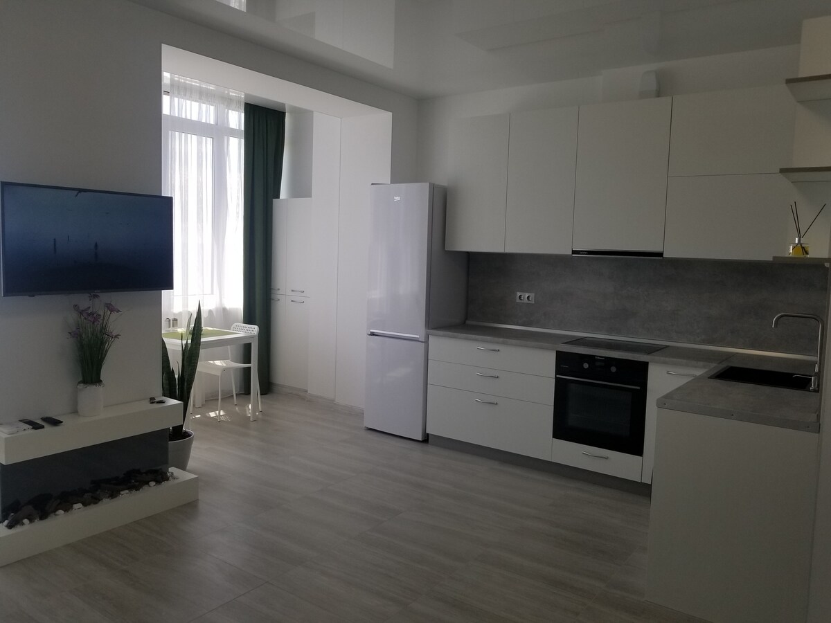 Vuelve a cargar en este lugar tranquilo y elegante. Un apartamento estudio de 30 metros cuadrados se encuentra en un edificio nuevo en el cuarto piso, edificio de 4 pisos (sin ascensor), por favor, ten esto en cuenta al reservar El apartamento está un poco lejos de la vida de la ciudad. Ten en cuenta la ubicación de la casa en el mapa. Ideal para huéspedes con su propio coche, o si los huéspedes utilizan el transporte público (cerca de la casa hay una parada de trolebús, hay un minibús (cada hora), que te llevará 20 minutos a la playa "Otrada", junto a la playa "Lanzheron"