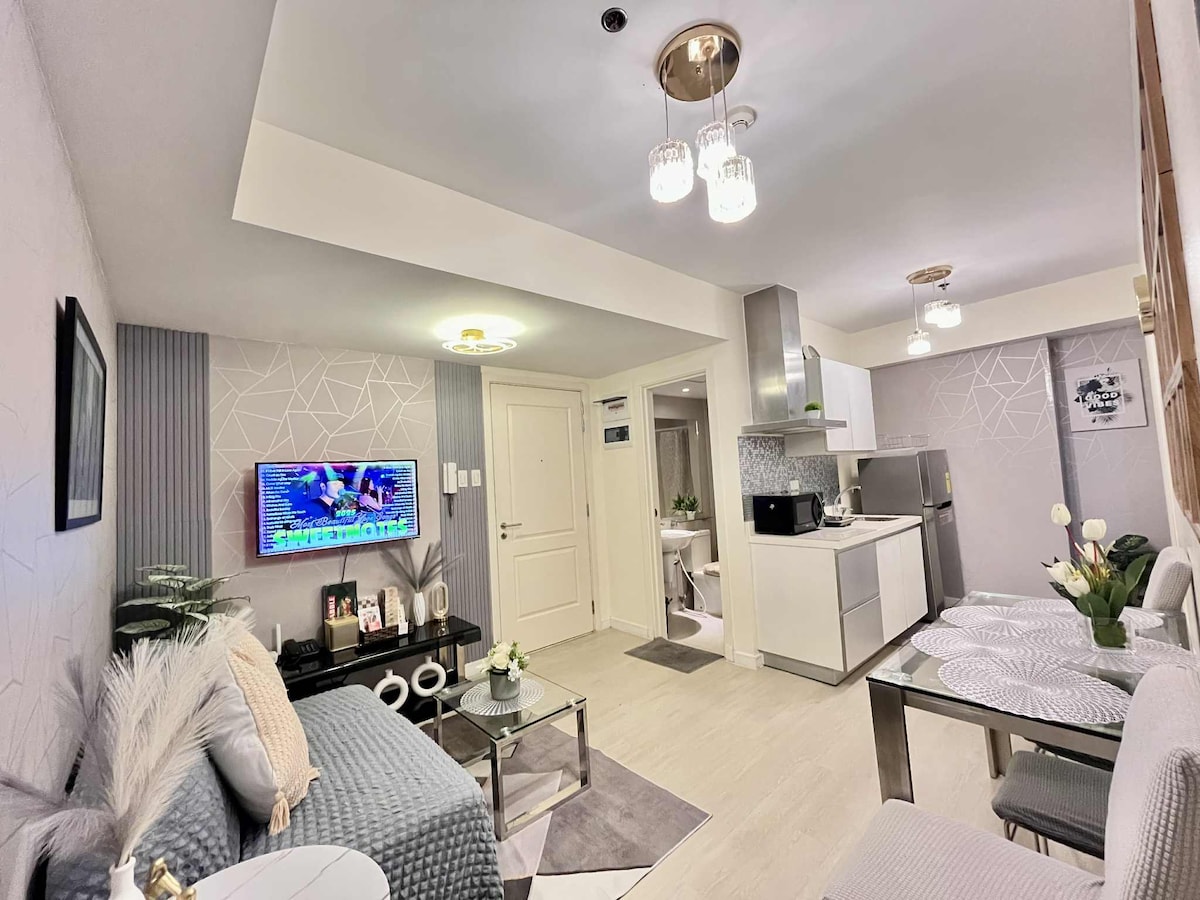 Stay in the center of the action in this one-of-a-kind place. Near to everything that you need. A very nice place to stay, hangout or just chill. * Aircondition * 65-inch TV * Soundbar Speakers w/ Subwoofer * WiFi * Air Purifier * Bed Size Double 54x75 * Pull-out Bed size twin KITCHEN * LG Refrigerator 7cuft. * Induction Cooker * Microwave Oven * Electric Kettle Pots & Pans * Kitchenwares & Utensils * Dinnerware BATHROOM * Single Point Water Heater * Fully Automatic Washing Machine