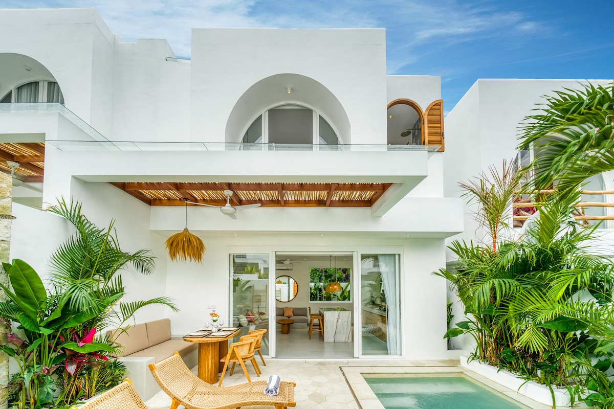 Villa de 1 habitación con piscina privada, a 5 minutos a pie de Dreamland Beach. Esta nueva y elegante villa de 2 pisos en Dreamland, Pecatu, ofrece la mezcla perfecta de lujo, privacidad y ubicación. ✔ Amplio de 1 dormitorio / 1,5 baños ✔ Piscina privada Sala ✔ de estar y comedor de concepto abierto con un diseño moderno y elegante ✔ Cocina totalmente equipada con todo lo necesario para una estancia larga Wifi ✔ de alta velocidad de 200 MBPS y televisores inteligentes en la sala de estar y el dormitorio Cama ✔Super King, vestidor y balcón privado