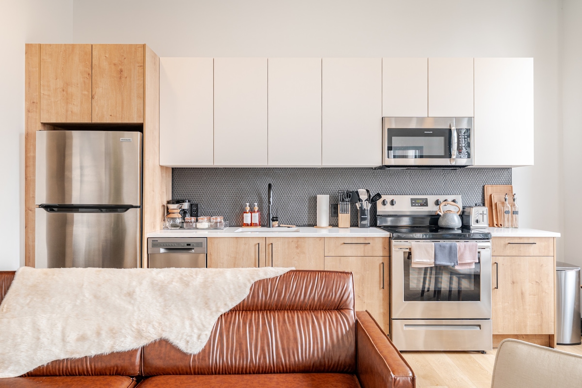 Disfruta de las comodidades modernas en este elegante apartamento de 1 dormitorio y 1 baño con dos televisores de pantalla plana de 60", una lujosa cama tamaño king y una lujosa ducha de vidrio. Mantente fresco con una lavadora/secadora en la unidad y comienza el día en la barra de café y té de cortesía. La isla de la cocina con taburetes es perfecta para comer o trabajar. Diseñado para la relajación y la comodidad, este espacio es la escapada perfecta para cualquier viajero.