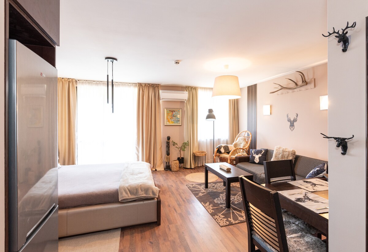 ¡Bienvenido a nosotros! Olvídate de tus preocupaciones y estrés en este lugar espacioso y tranquilo con impresionantes vistas de las montañas Pirin. El estudio es adecuado para tres adultos o dos adultos con dos niños de hasta 10 años. Ubicado en el Alpine Lodge con SPA y estacionamiento. Los huéspedes pueden usar la piscina, el gimnasio y el lobby bar con chimenea y TV de forma gratuita. Hay una sauna y un baño turco disponibles por un cargo adicional. Se encuentra a poca distancia a pie del centro de la ciudad y de la primera estación de ascensores.