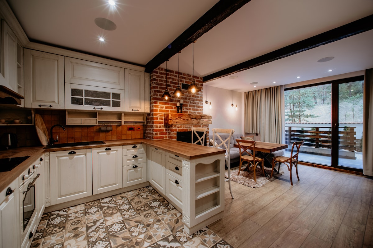 Lugar encantador, tranquilo y acogedor. Apartamento ubicado en el centro de la ciudad, pero también en el bosque. Un control inteligente del equipo para la mayor comodidad posible. Este lugar puede garantizar tus vacaciones deseadas. Tiene dos dormitorios privados, un baño, terraza y un patio con cocina de verano, SPA ( sauna y jacuzzi) . La cocina tiene todos los elementos esenciales para estadías cortas y largas. Un camino ecológico conduce a algunos de los lugares más bonitos de la ciudad.