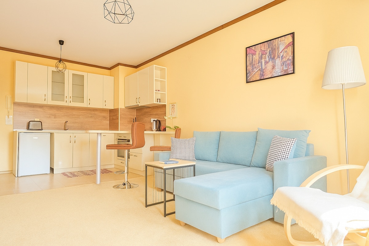"Estudio de confort en alquiler en Bansko, ideal para parejas. Con muebles modernos, terraza con vistas panorámicas a las montañas y una posición orientada al sur. Acogedor y cálido, ubicado en una zona tranquila pero al mismo tiempo cerca de todos los servicios, restaurantes y tiendas. Perfecto tanto para unas vacaciones de esquí como para una escapada de verano en las montañas. Totalmente equipado para una estancia cómoda en todas las estaciones, espacio de estacionamiento incluido en el precio. Posibilidad de alquiler de temporada o durante todo el año ”.