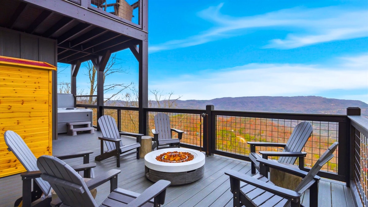 ¡Oh, las vistas al atardecer! 2 fogatas|Loft de juegos|Bañera de hidromasaje