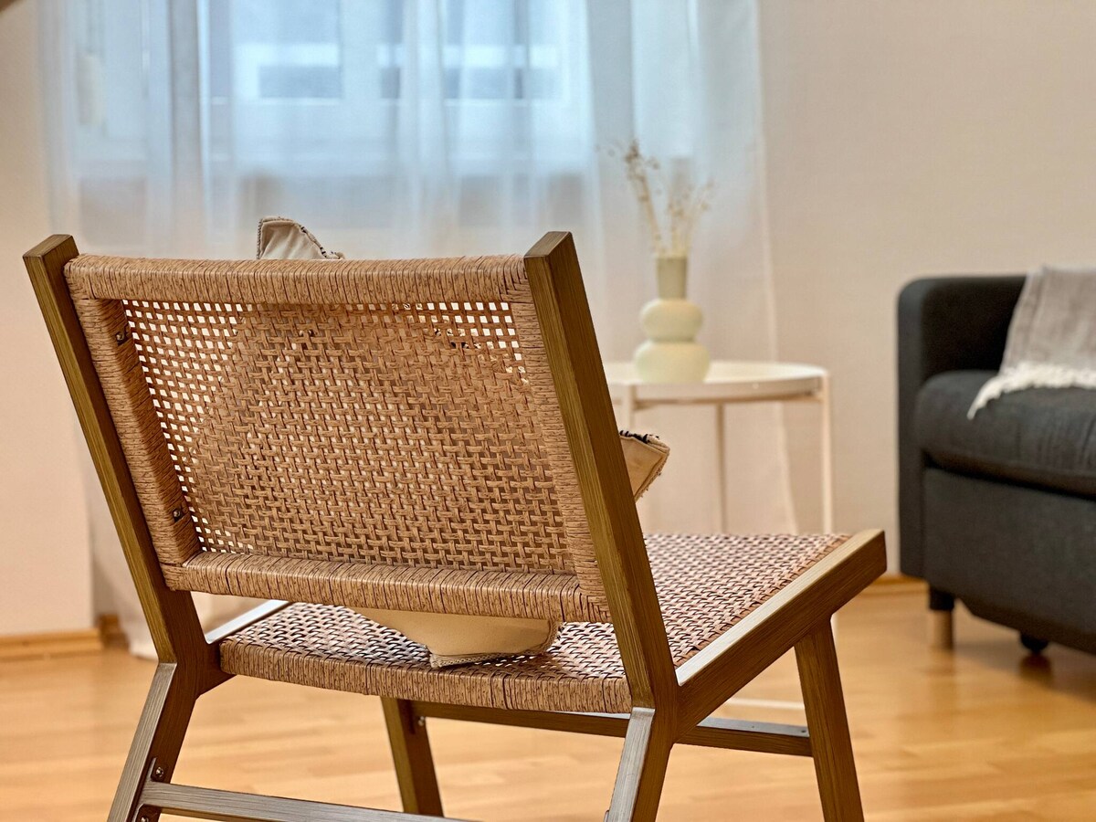 Apartamento muy cómodo y bien equipado con TV de pantalla plana, WLAN de fibra de vidrio y un baño grande. Cocina totalmente equipada con lavavajillas, horno, etc. El apartamento está situado en el sótano (6 escalones hacia abajo pero muy luminoso), orientado al sur, soleado, tranquilo, con entrada independiente para una privacidad sin molestias. El apartamento tiene un jardín/parque infantil de 1000 m2 donde niños, perros y adultos se sienten como en casa lejos del tráfico. Acceso gratuito a nuestra oficina de coworking en la casa vecina.