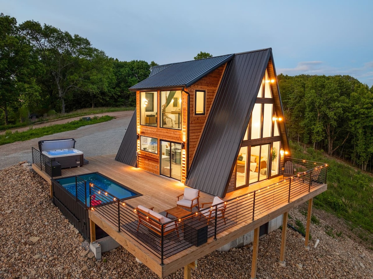 Bienvenido a «Stargazer», tu refugio de lujo con estructura en forma de A enclavado en las impresionantes colinas de Ozark. Disfruta de una comodidad inigualable con nuestros servicios de primera calidad, que incluyen un relajante jacuzzi y un acogedor pozo de fuego, perfecto para observar las estrellas bajo el prístino cielo nocturno. Rodeado de belleza natural, «Stargazer» ofrece una escapada serena donde el lujo moderno se une al encanto atemporal.