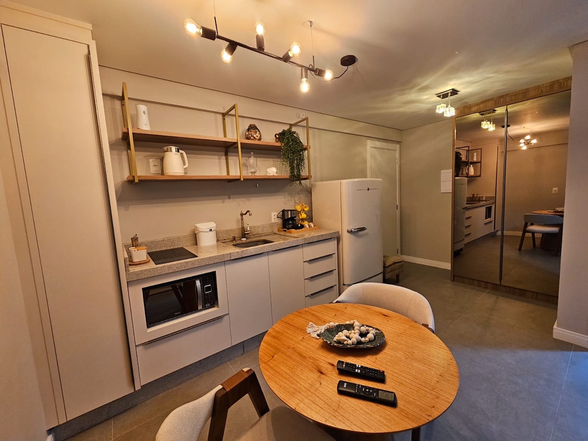 Sofisticado apartamento tipo estudio ubicado a 800 metros del parque Vila Germânica, lugar de eventos como el Oktoberfest. Rodeado de restaurantes, bares y supermercados. Todo para su comodidad: Smart TV 50" Samsung, aire acondicionado split, ducha de gas, wifi fibra 240mb, cocina completa con heladera Brastemp, microondas, horno, estufa, campana extractora, cafetera, purificador de agua, lava y seca, armarios, y por supuesto ¡una cama queen con el mejor colchón!