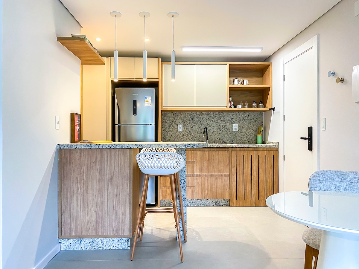 Beautiful studio apartment with garage, in the center of Blumenau, near everything! Building has a gym and an incredible rooftop pool. The apartment is complete and very stylish. Double bed, sheets, covers, pillows, bath towels, AC. Full kitchen with refrigerator, microwave and tableware for 2. Laundry with washer+dryer machine, iron table and iron.