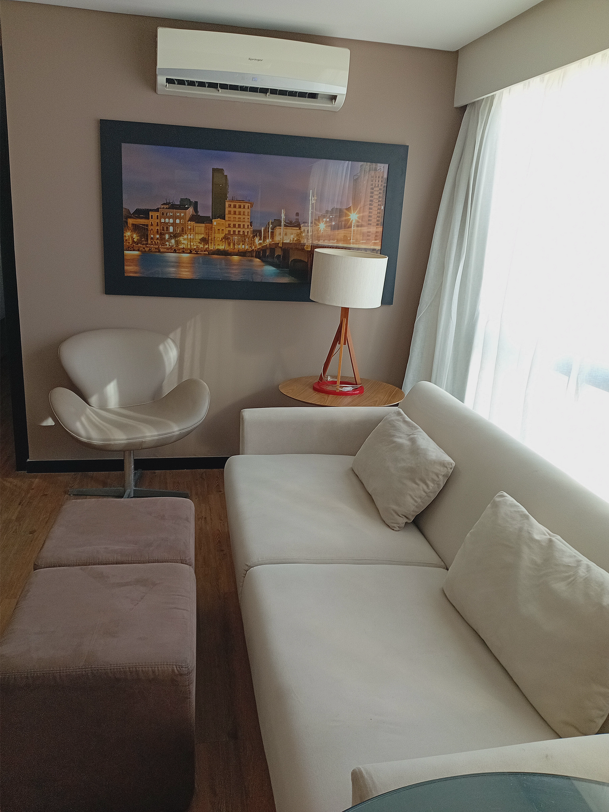 ¡Vive el lujo en esta escapada moderna (lanzada en abril/25)! Relájate en el hidromasaje con cromoterapia y controla la iluminación con el estudio Alexa Echo de 330W RMS. El espacio tiene un aire acondicionado de 18 000 BTU que sonríe mucho, minibar, lavadora y secadora y ropa de cama de primera calidad. Destaca por el entorno de maquillaje con silla profesional, secadora y espejo GG con LED. Con una sofisticada decoración bohemio, este espacio se diseñó para proporcionar comodidad y elegancia. ¡Reserva ahora!