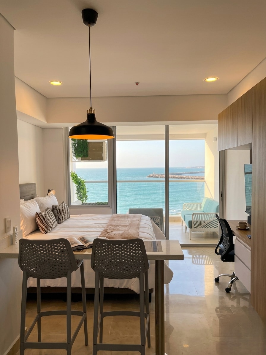 ✨ Bienvenido a tu refugio en Cartagena: un apartamento de lujo en piso alto frente al mar, con dos balcones privados y vista panorámica 180° al Caribe y la bahía. Diseñado para tu confort, ofrece sala moderna con ventanales, cocina equipada, WiFi rápido y check-in digital. Relájate en la piscina infinita, disfruta el bar o entrena en el gym con vista al mar. En Bocagrande, a pasos de la playa y cerca de la ciudad amurallada, tu estadía será inolvidable. 🌊🌴
