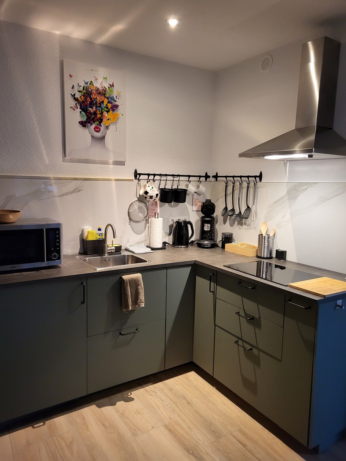 The 60 square metre, modern accommodation offers space for up to 4 people and impresses with its high-quality furnishings. An open-plan living area with pull out sofa, TV and dining area leads into a fully equipped kitchen - ideal for cooking and socialising. A bedroom with 2 single bed guarantees restful nights, while the elegant bathroom ensures relaxation. Wi-Fi and a washing machine round off the offer and make the accommodation the perfect choice.