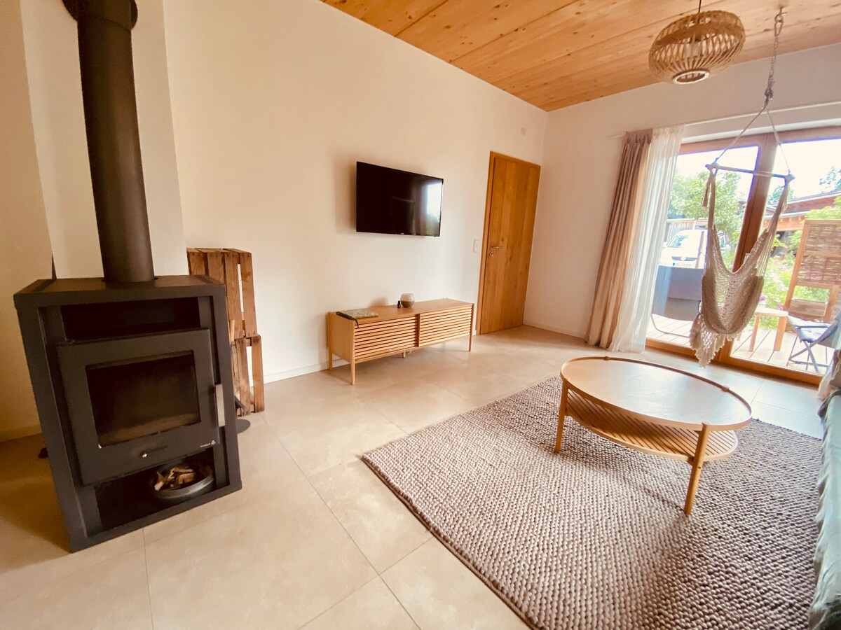 Nuestro apartamento Am Klopferbach I se encuentra al final de una calle lateral enclavada en el campo. El departamento de dos habitaciones está ubicado en la planta baja de la casa de madera construida en 2020, que consta de una entrada, una luminosa y acogedora sala de estar, una cocina pequeña con servicios básicos, baño y dormitorio con piso de madera y terraza en el bosque. El Klopferbacherl fluye a los pies de la propiedad y el parque ofrece un espacioso parque infantil además de una piscina de pub.