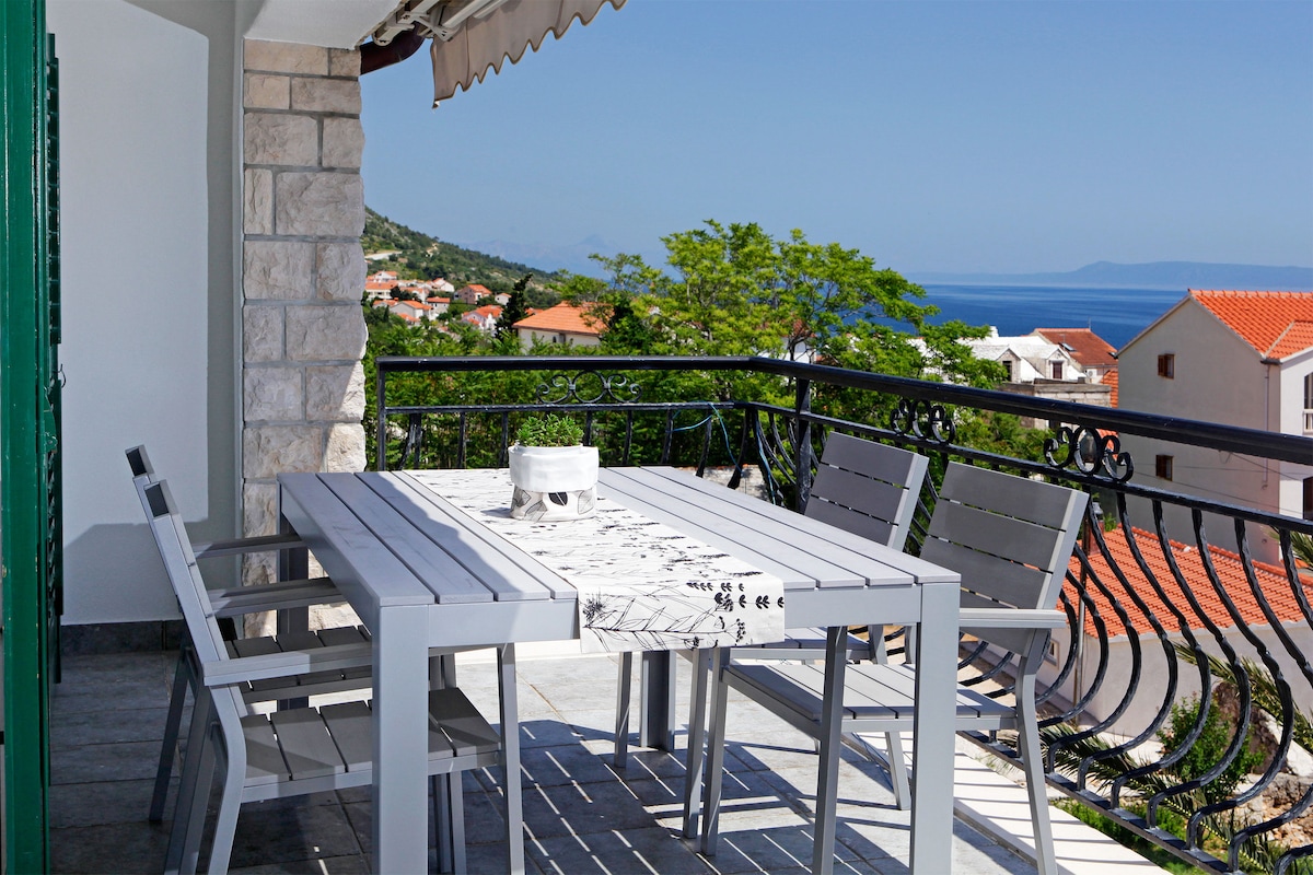 Cómodo y luminoso espacio con dos balcones con vistas preciosas. Un balcón está orientado al puerto de la ciudad y otro al mar y a la isla de Brač. El apartamento está situado en la parte tranquila de Jelsa, pero muy cerca del centro de la ciudad. La gran playa de arena está a solo 5 minutos a pie del apartamento. También puedes nadar literalmente delante del apartamento, en el pequeño muelle. El mercado está a 5 minutos a pie, al igual que la plaza principal.