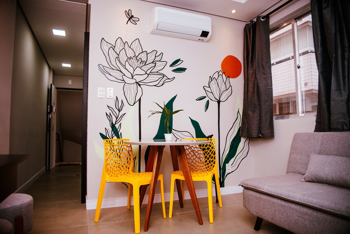 Este apartamento de 55 m² es ideal para parejas y ejecutivos en viajes de negocios. Tiene todo lo que esperas de un apartamento: practicidad y tecnología. Para aquellos que vienen a pasar la Nochevieja en Santos, pueden disfrutar de las festividades sin siquiera salir del edificio. Desde el área de la piscina, puedes disfrutar de la vista al mar, los fuegos artificiales y el ambiente festivo de la ciudad sin tener que lidiar con el tráfico, las multitudes o un viaje agotador después de los fuegos artificiales.