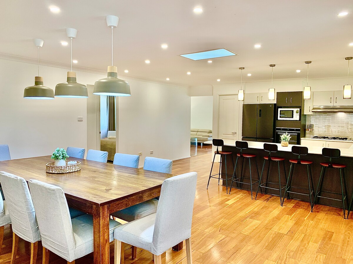 Come Relax! Accommodation for 7 with Culburra Surf Beach at the end of the street & short drive to the white sands of Jervis Bay! Proximity to many beautiful south coast event venues. King, Queen, Triple rooms, air conditioning, full kitchen, purified water, dishwasher, washer, dryer, 55’ smart TV, unlimited NBN/WiFi/Netflix. BBQ & firepit with extensive private undercover entertaining areas. Outdoor freshwater still bath hot tub/shower. Child and pet safe yard.