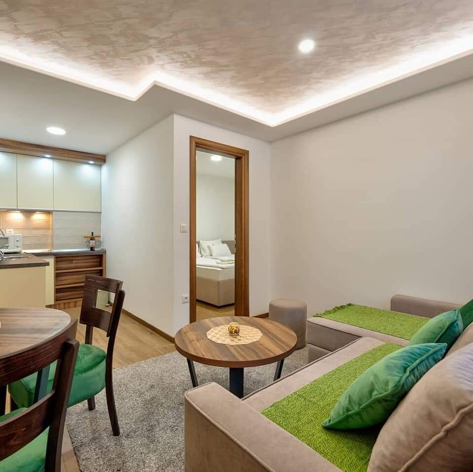 El apartamento Zlatiborski sjaj lux tiene 38 metros cuadrados y se encuentra a 300 metros de la Plaza del Rey y el lago en la calle Svetogorska n.º 19a, cerca de la iglesia, rodeado de un bosque de pinos. Está ubicado en un edificio de lujo completamente nuevo, energéticamente eficiente, que cuenta con ascensor y recepción. Cuenta con Wi-Fi, televisión por cable y plaza de aparcamiento. La calefacción es de suelo radiante con radiadores noruegos. Está equipado con dos televisores LCD, tiene cocina equipada, vajilla, tostadora, microondas, cafetera Dolce Gusto, ropa de cama, toallas, secador de pelo, plancha.
