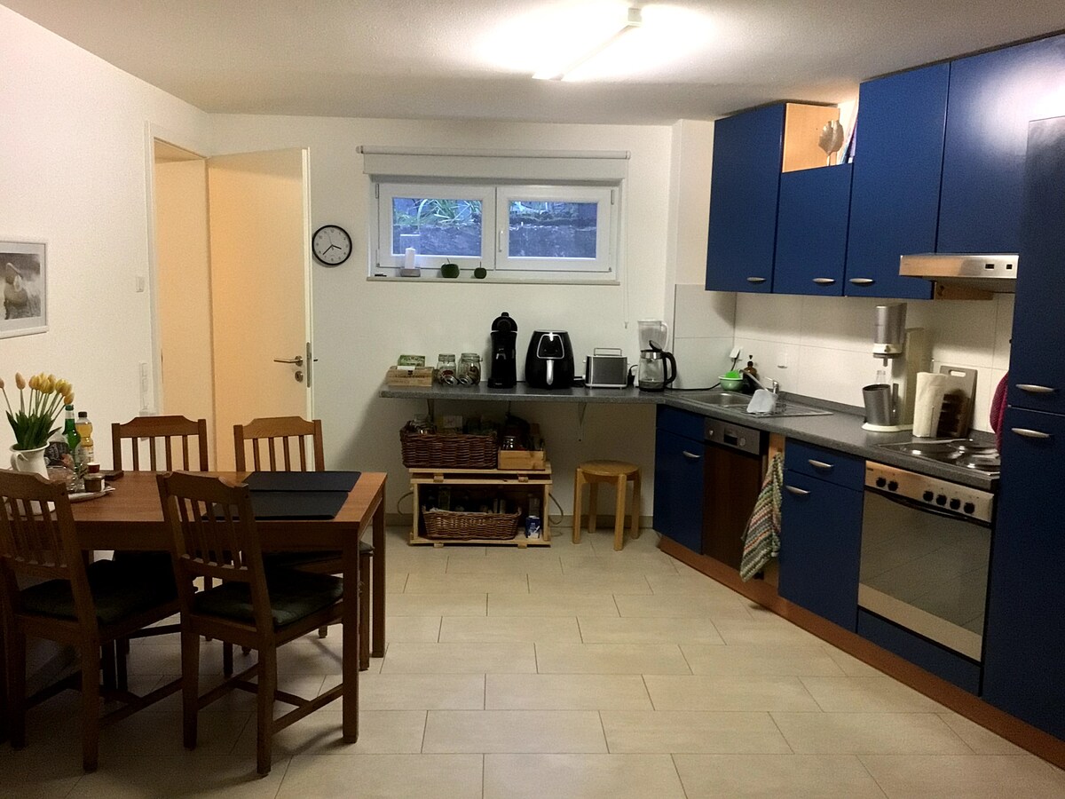 Mi casa, construida en 2007 en estilo del sur de Francia, irradia un ambiente vacacional. El apartamento está en el sótano, tiene su propia entrada y una pequeña zona de terraza orientada al este. En la gran habitación se encuentran la cocina, el comedor y el dormitorio en uno, pero agradablemente divididos. Hay material de lectura y un juego de backgammon para pasar el tiempo, así como Netflix. A través de un pequeño pasillo con armario y escritorio se llega a un amplio baño con ducha a ras de suelo. Aquí también encontrará un albornoz, una esterilla de yoga y los utensilios que necesita :-) (champú, acondicionador, gel de ducha, kit de costura, tampones, maquinilla de afeitar desechable, pañuelos de papel, espejo de mano, secador de pelo). La casa está rodeada por un acogedor jardín con muchos asientos. El gran patio en el sur también está disponible para mis huéspedes con un grupo de salón, una parrilla y una hamaca. Aquí se puede desconectar y relajarse con tranquilidad. Estoy a su disposición para cualquier información, pregunta, para traer panecillos y para cumplir pequeños deseos. Rettigheim está rodeado de bosques, prados y hermosos viñedos. Panadería, peluquería, tienda de comestibles y posadas se encuentran en el mismo pueblo. Se puede ir a pie a Malsch y a la capilla de peregrinación en el Letzenberg, o pasar el día en el aeródromo, el campo de golf o el zoológico. El hermoso bosque de Odenwald está también a tiro de piedra, o ¿qué tal una escapada romántica a Speyer? Si quiere ir de compras, debe ir a Mannheim. Rettigheim es un pequeño pueblo con conexiones ideales a las autopistas A5 y A6. Heidelberg, Speyer, Mannheim, Karlsruhe están a 30 minutos en coche. También con el S-Bahn funciona muy bien cada media hora desde la estación de Rot/Malsch. La parada de autobús se encuentra a 3 minutos a pie de nosotros a la vuelta de la esquina. También se puede ir en bicicleta a SAP St.Leon-Rot por una carretera directa y asfaltada a través de prados y campos en 10-15 minutos. El entorno es muy tranquilo, cercano a la naturaleza y, sin embargo, bien conectado con ciudades como Heidelberg, Speyer, Mannheim, Sinsheim y Karlsruhe.