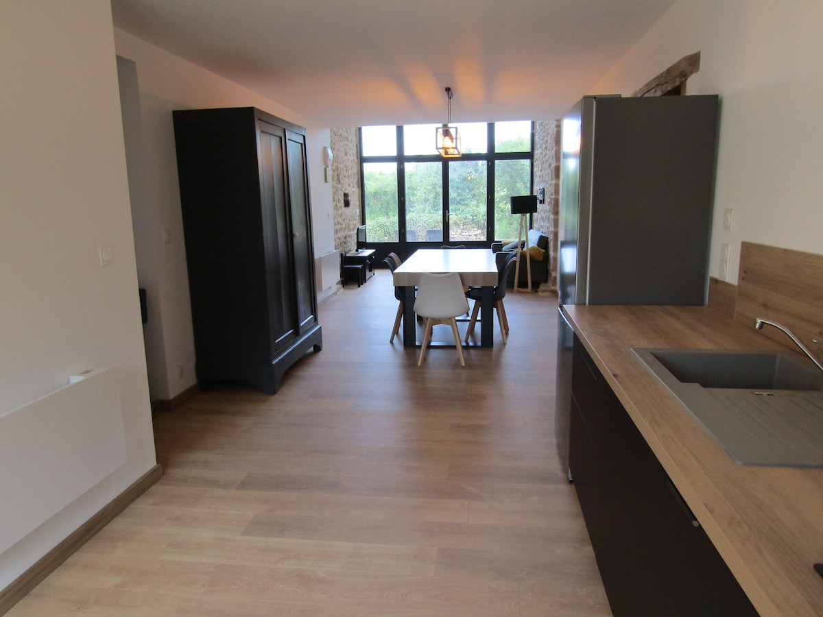 Bienvenue chez nous, Françoise, Francis et notre chienne Golden retriever toute gentille. Vous logerez dans une dépendance rénovée en studio de plain-pied située dans la cour de notre longère. Le studio Une pièce comprenant un coin cuisine aménagée, un salon, un coin bureau et un lit pour 2 personnes possibilité d'accueillir un bébé, sur demande. Une salle de bain. Chauffage électrique.