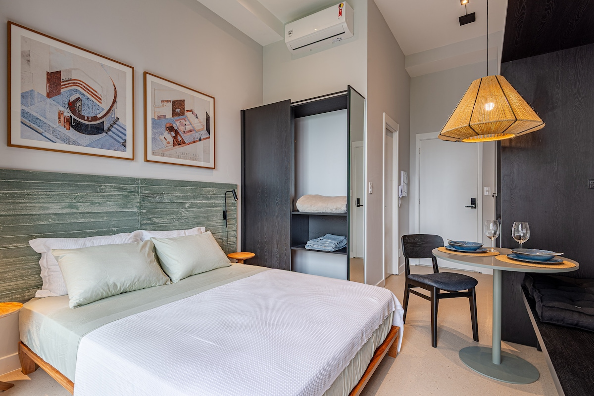 Estudio cerca del Parque Ibirapuera con decoración moderna, iluminación LED incorporada, proporcionando comodidad y bienestar. Puerta con cerradura electrónica, aire acondicionado, cortinas con blackout. Conserjería 24 horas Calle pequeña y arbolada Wi-Fi, piscina, sauna, gimnasio, bicicletero Grifo con caño separado con agua filtrada Colchón (pareja) Simmons con canapé Silla de trabajo Herman Miller Smart TV Samsung 65" Cafetera Nespresso Citz Cocina Microondas Lavadora y secadora