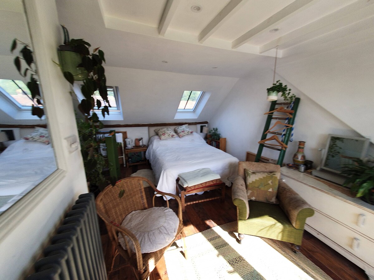 Habitación en el ático con vistas al castillo. Un santuario verde. BnB.